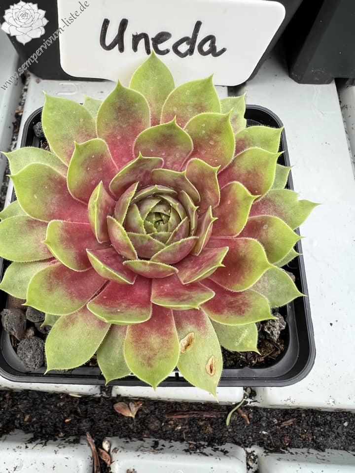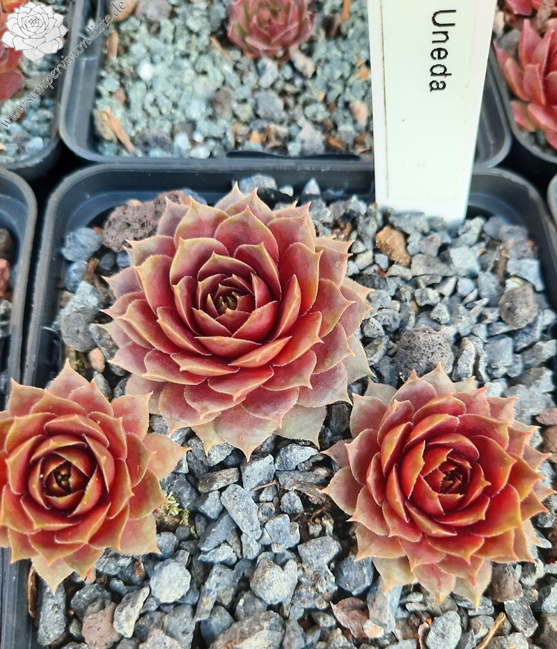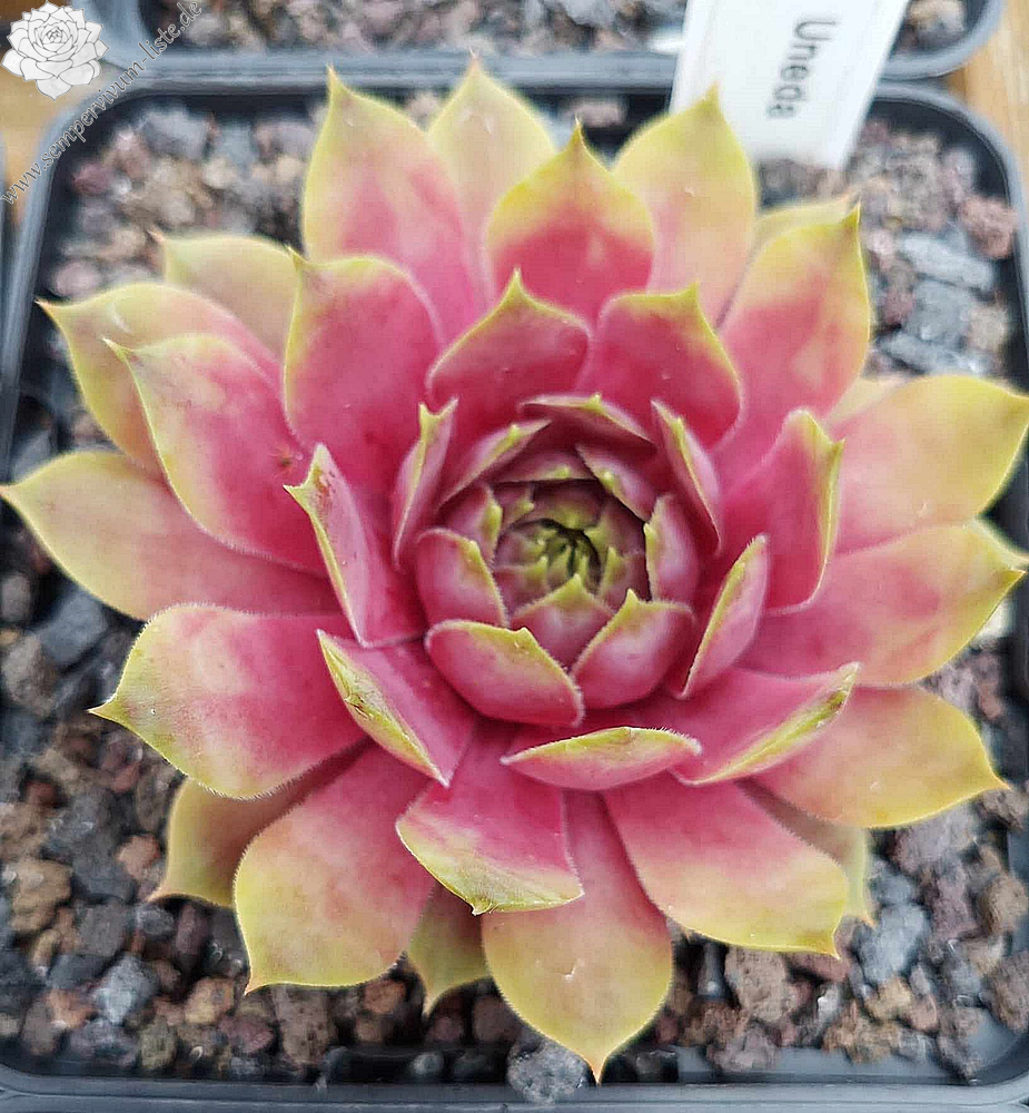 'Uneda' ist eine sehr schöne, kindelfreudige Züchtung, die ihre Rosetten im Frühjahr in leuchtendem, dunklen Pink erscheinen lässt. Sie hat glatte, rundlich Blätter, die spitz auslaufen. Die Rosetten haben eine Größe von 3-4 cm. Zum Sommeranfang verblasst die Farbe etwas, ohne dass sie an Leuchtkraft verliert. Bei starker Sonneneinstrahlung im Hochsommer werden die Rosetten fast gelb mit einem zart pinkfarbenen Kern aus der Mitte heraus. Nach geraumer Zeit verändert sich das Gelb in ein wunderschönes Lindgrün und der pinkfarbenen Kern wird immer größer. Im Herbst verliert sie ihre Leuchtkraft, wird ganz normal grün mit lilafarbenen Herz.