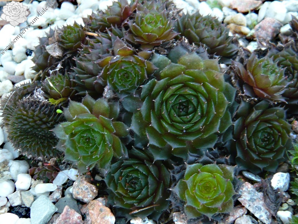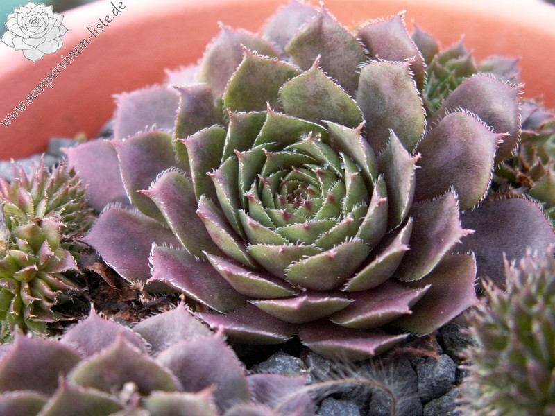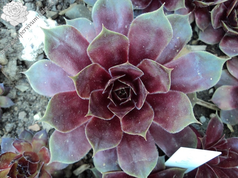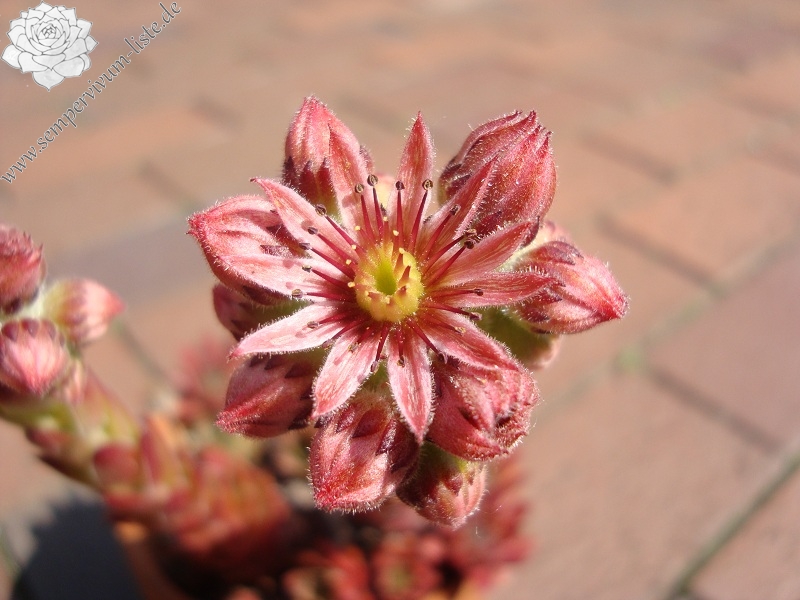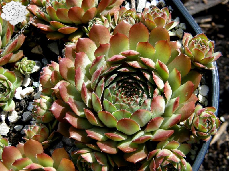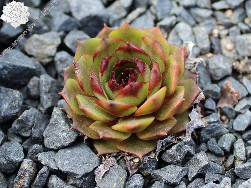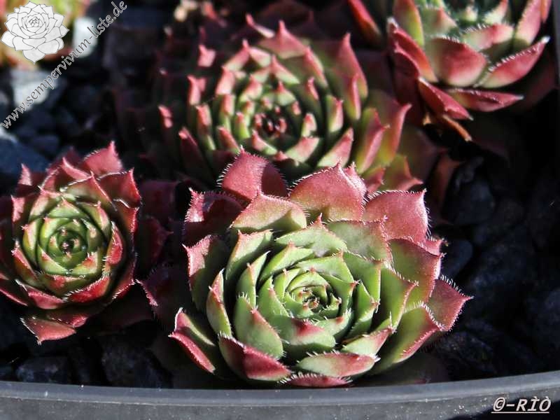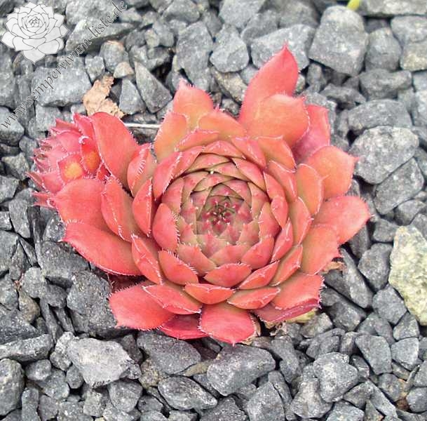 Eine ganzjährig leuchtende Schönheit mit ziegelroten Rosetten aus den USA. Der Kultivar ähnelt der beliebten Sorte 'Bedivere', die Rosetten sind etwas dunkler gefärbt.