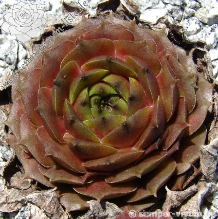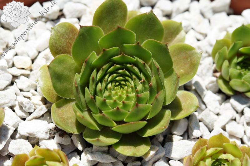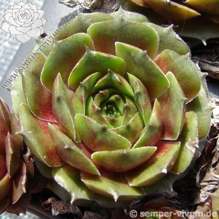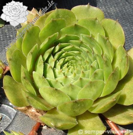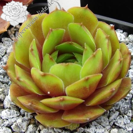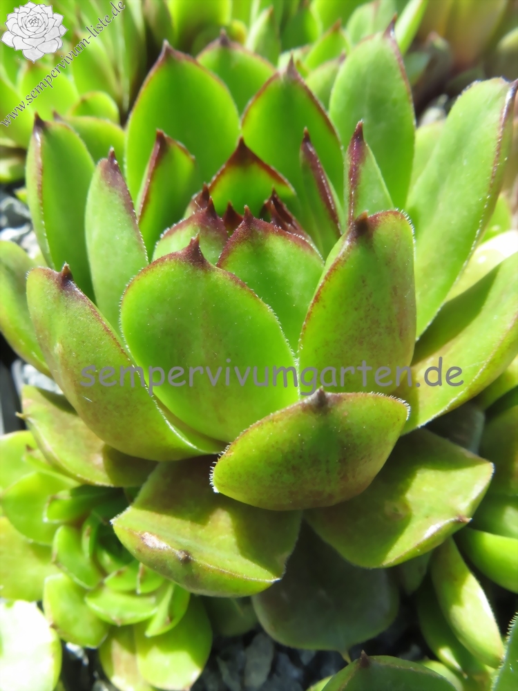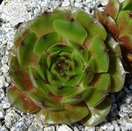 Sempervivum 'Waldmeister' zeigt eine ganz besondere Grünfärbung. Die dunkel gefärbten Blattspitzen heben sich deutlich ab und verleihen der Pflanze eine etwas düstere Wirkung. Der Sortenname ist wirklich passend gewählt. Die Rosetten erreichen einen Durchmesser von 9cm und sprossen gut. Eine wirklich interessante Züchtung