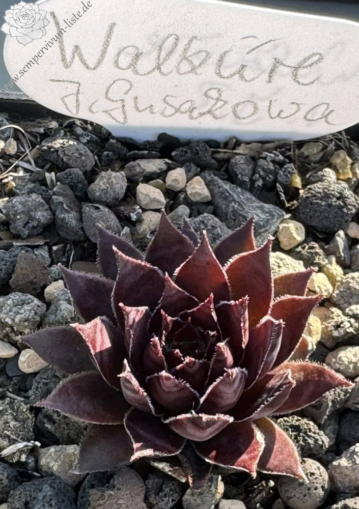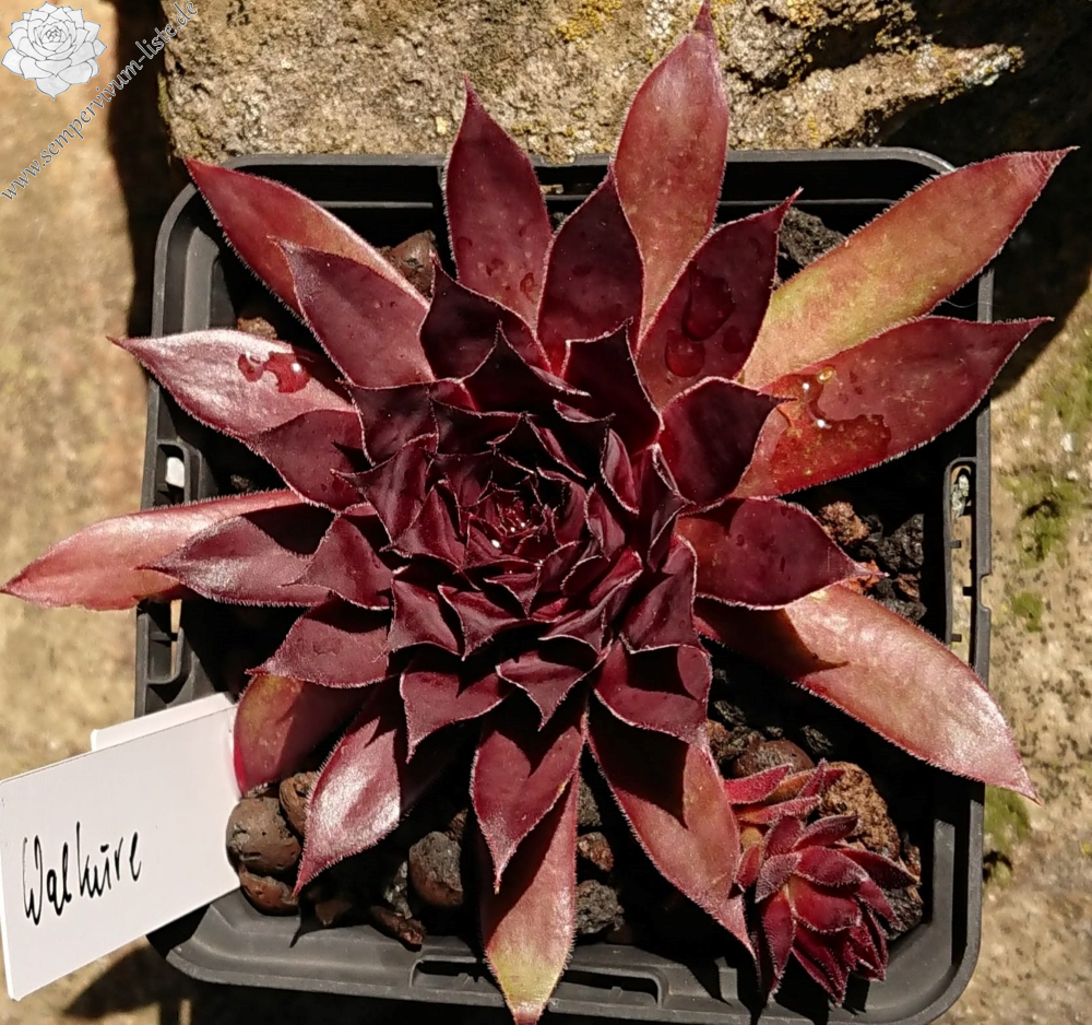 'Walküre' sind große, 13 Zentimeter hohe Rosetten mit glatten, schmalen, langen Blättern. Im Frühling ist die Farbe schwarz und burgunderrot, im Hochsommer wird sie etwas heller, kirschbraun, aber die dunkle Farbe bleibt die ganze Saison über bestehen. Walküre, Furia und Galaxie sind Einzelkulturpflanzen, die durch Kreuzbestäubung von 'Leopold' und 'Red Ant' entstanden sind.