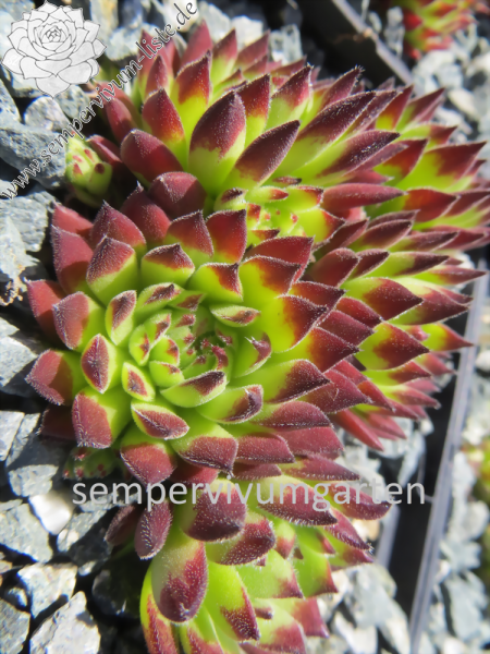 Sempervivum ‘Warm Valley’ bildet kleinere Rosetten, die ganz dichte Polster bilden. Die grüne Grundfarbe und die dunkelroten Blattenden ergänzen sich perfekt.