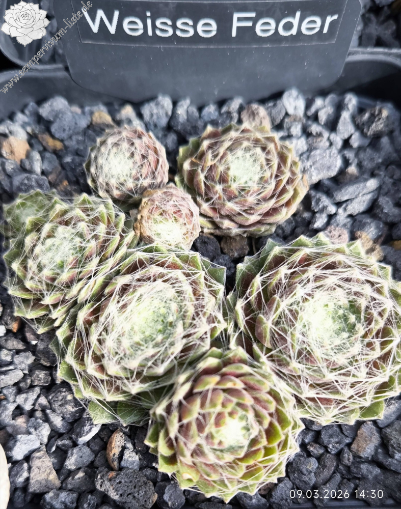 Die mittelgroßen Rosetten zeigen im Frühjahr kräftig rote Farben. Im Sommer breitet sich die dichte, weiße Bespinnung über die ganzen Rosetten aus! Muss man haben!