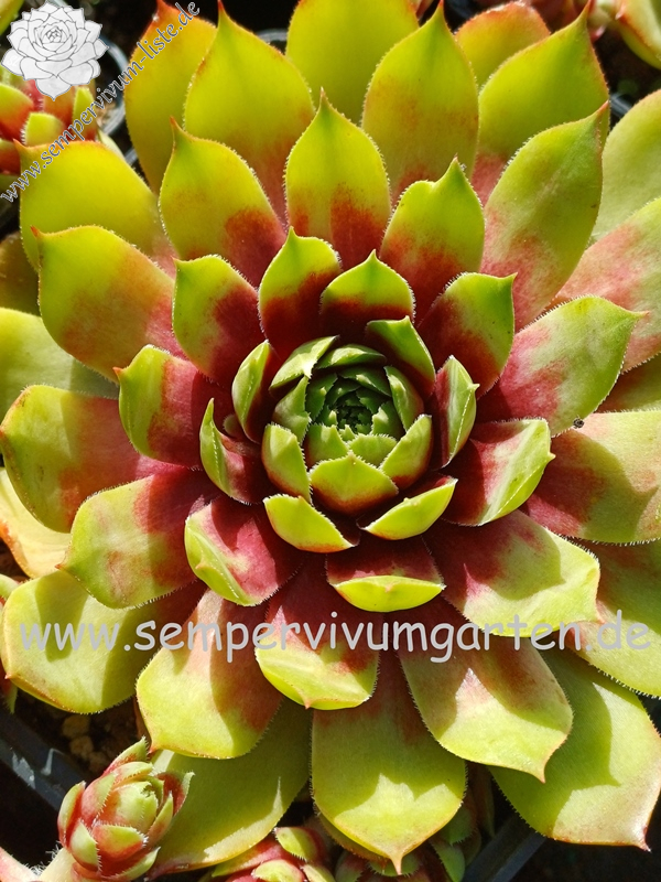 Mit Sempervivum 'Xabi' haben wir einen ganz neuen Hauswurz im Sortiment, der im Sommer unglaublich intensive Farben zeigt. Die großen offenen Rosetten können einen Durchmesser von 10 cm erreichen. Dieser robuste Hauswurz fällt besonders vom frühen Sommer bis spät in den Herbst auf. Die Pflanzen besitzen eine leuchtend, fast gelbe Grundfärbung und im Zentrum zeigt sich ein dunkelroter Farbring. Die rote Färbung wird nicht klar abgegrenzt und verschwimmt mit der gelben Grundfärbung. 'Xabi' ist unempfindlich und sprosst willig. Es werden schnell dichte Polster gebildet und nur wenige Blüten gebildet.