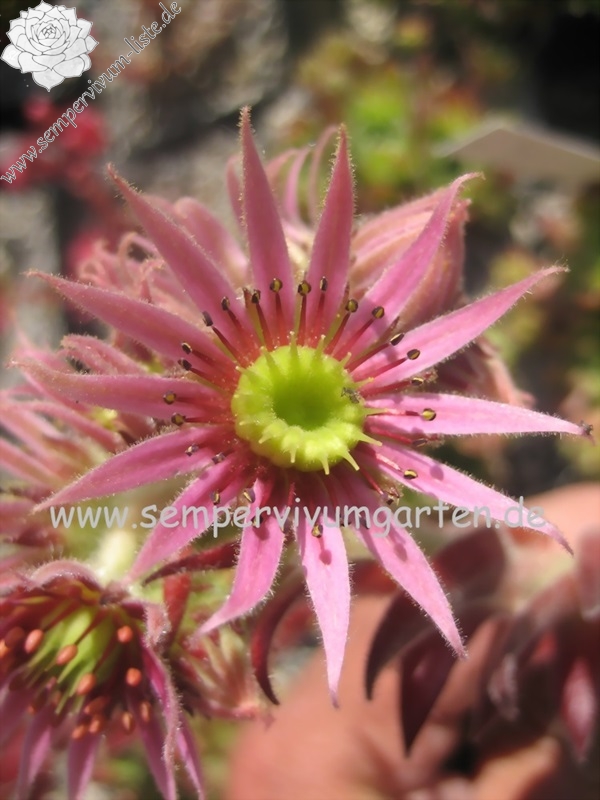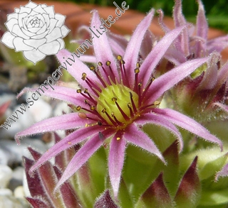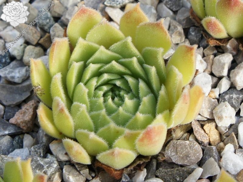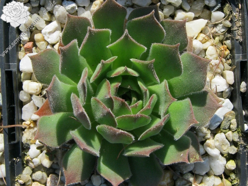 Ein ganz anderer Sämling von S. arachnoideum 'Silberknopf', der einen Durchmesser von 10 cm erreicht! Die Pflanze besitzt einen blass hellgrünen Grundton mit dunkelroten Blattenden, die wie ein roter Ring um die Rosetten wirken. Im Rosettenzentrum zeigen die Blätter nur kleine rote Spitzen, nach außen hin wird der Rotton dann immer stärker und die gefärbten Spitzen auch immer größer. Die äußeren Blätter zeigen bis zu 2,5 cm lange dunkelrote Spitzen. Die Blätter sind leicht flaumig und stehen steil nach oben. Eine gut wachsende und sprossende Hybride, die einen besonderen Reiz besitzt.