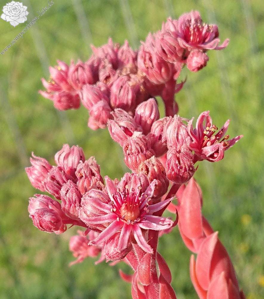 Vielblättrige Rosetten mit einem Durchmesser von ca. 3,5 cm von samtiger Textur in graugrüner Tönung, die sich im Frühling rosa verfärben. Die Pflanze formt kleine und kompakte Hügelpolster. Eine Auslese von Sämlingen aus der Saat von S. marmoreum ssp. erythraeum.