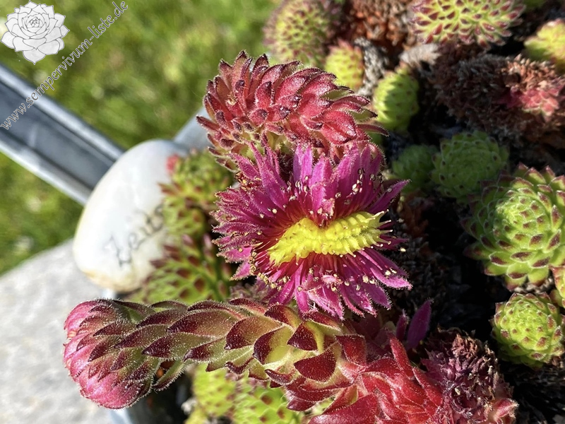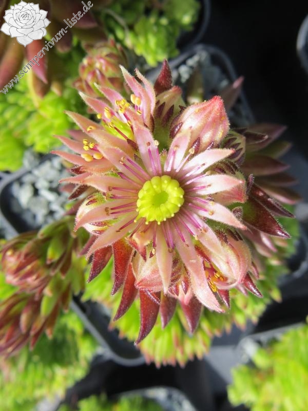 Sempervivum 'Zeitpunkt' ist ein wüchsiger Hauswurz, der dichte Polster bildet. Die kleinen, hellgrünen Rosetten erreichen einen Durchmesser von nur 4cm und zeigen einen leichten Hauch ins Gelbe. Besonders gut gefallen mir die kleinen rötlichen Spitzen, mit der leichten Behaarung im Frühjahr. Die hellrosanen Blüten erscheinen willig und werden gerne von Insekten besucht. Schade, dass noch immer viele Sempervivumfreunde keinen Wert auf Blüten legen! Der kleine hellgrüne Hauswurz ist ein Nachkomme von 'Zeitsprung' und ergänzt die Serie sehr gut. Im Sommer besitzen die kleinen Polster ebenfalls eine gelbliche Färbung. Die Pflanzen zeigen sich auch bei großer Hitze und Trockenheit als sehr anspruchslos.
