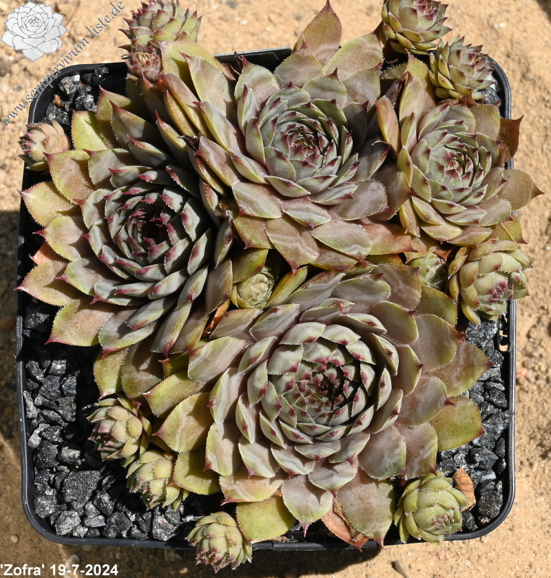 Sempervivum 'Zofra' ist ein mittelgroßer Typ, der sehr helle Farben zeigt. Die dunklen Blattspitzen heben sich deutlich ab.