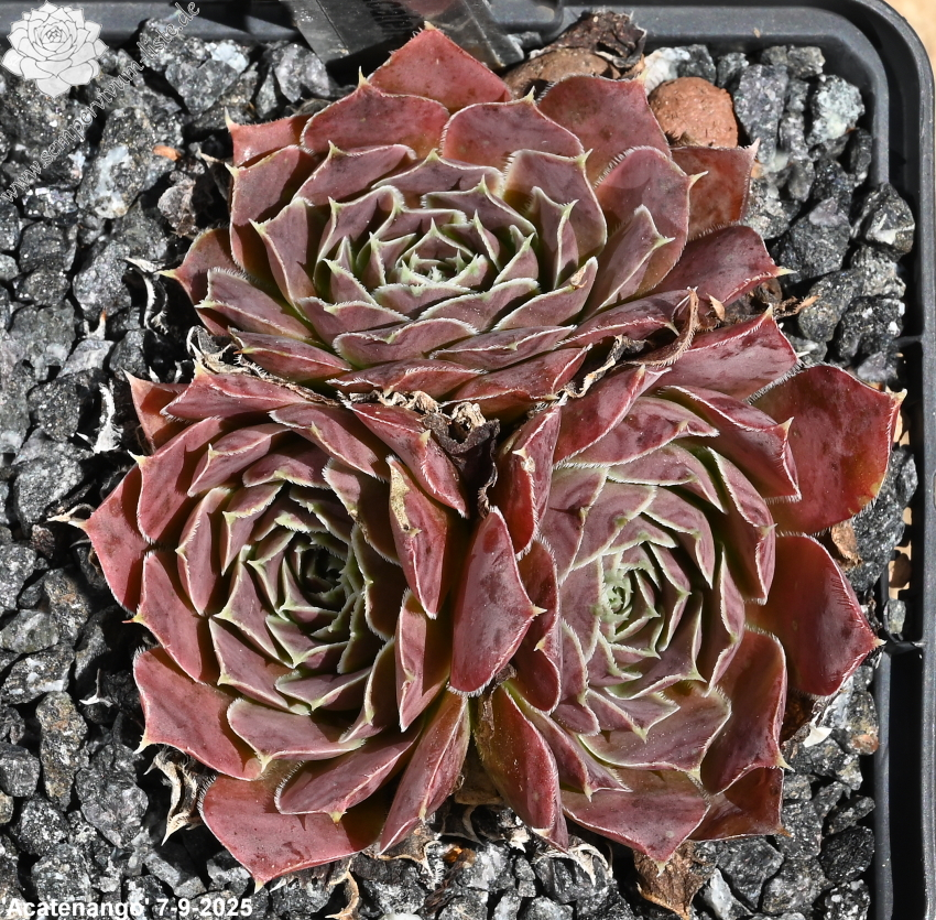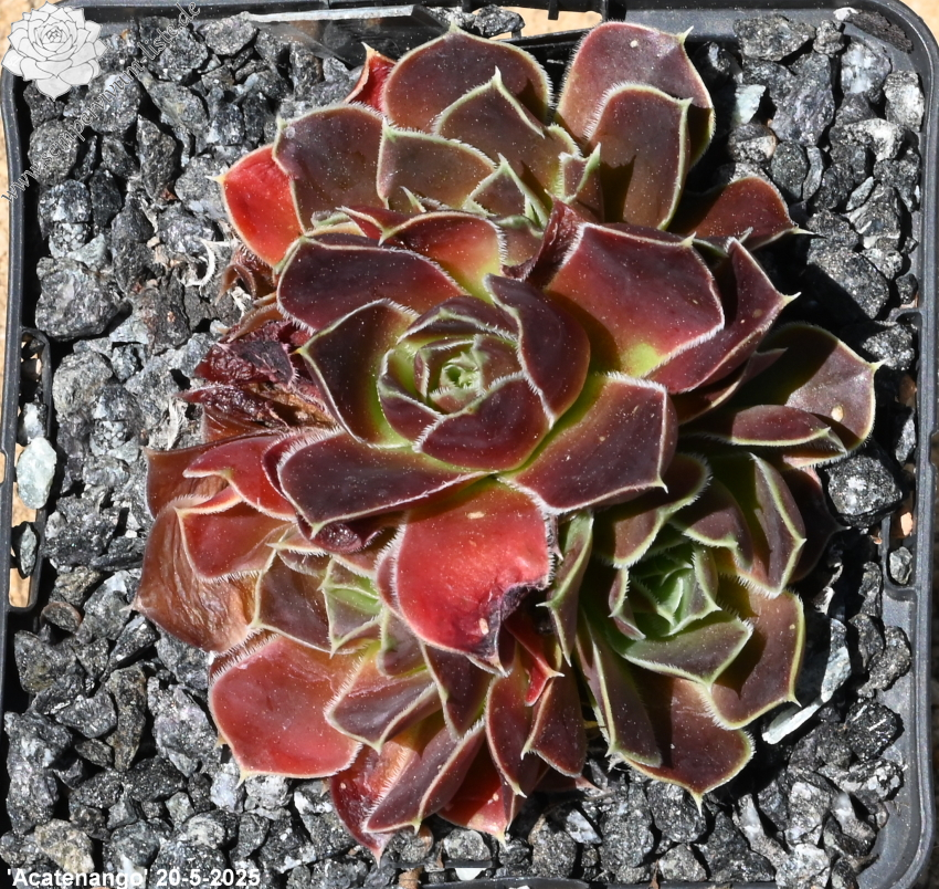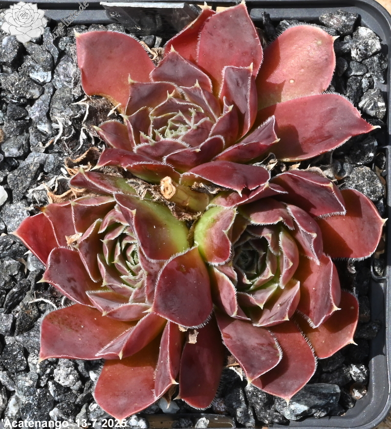 Rosetten bis 7 cm, Blätter breit spatelig, weinrot, Blattränder leicht bewimpert.