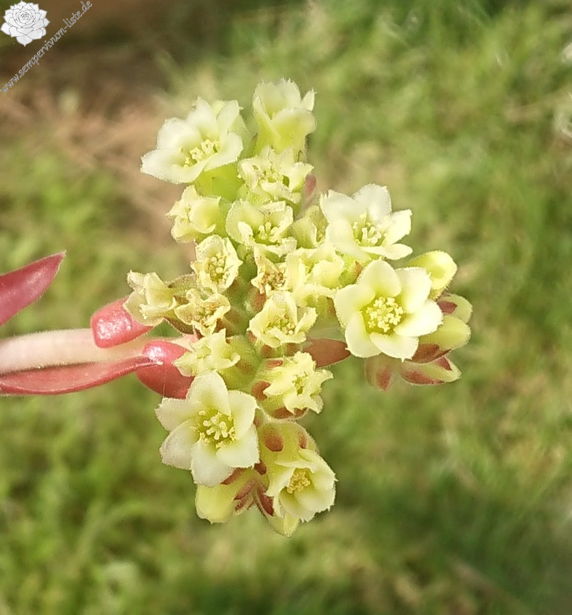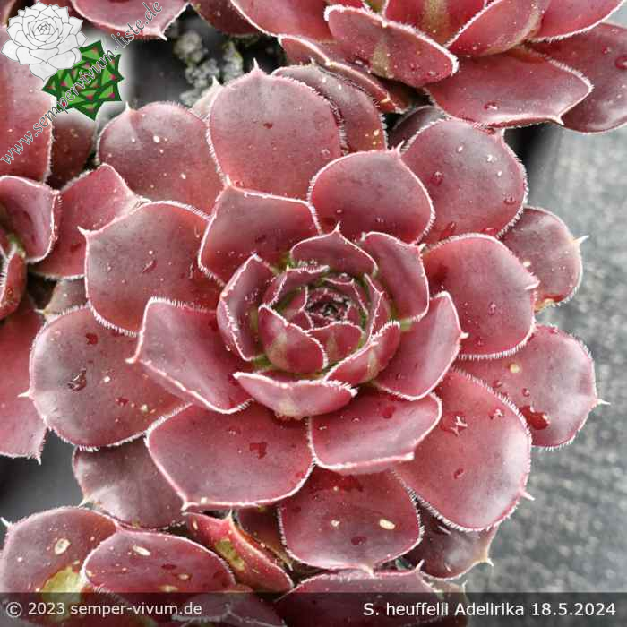 Mit Jovibarba heuffelii 'Adelirika' haben wir eine schön gefärbte Züchtung von André Smits im Sortiment. Die schönsten Farben zeigen die Pflanzen in den Sommermonaten, wie man auf den Bildern sehen kann. Sie bilden wüchsige Rosetten, die einen Durchmesser von etwa 9 cm erreichen können. Gerne werden die gelben Blüten von Hummeln besucht. Wie bei allen Jovibarba heuffelii ist die Vermehrung langwierig!