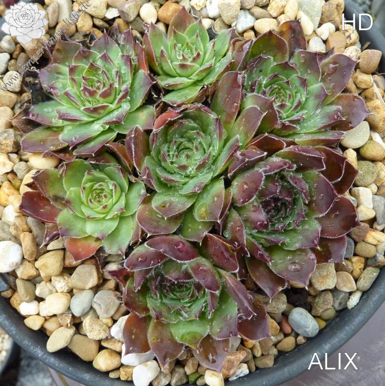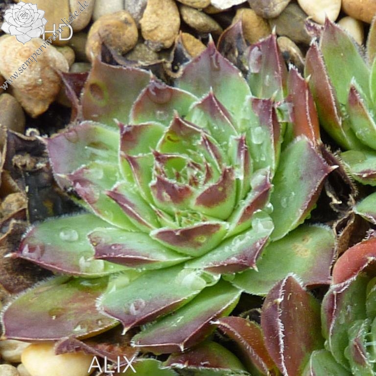 Rosetten bis 6 cm, Blätter oval, lang bespitzt, helles Grün mit bräunlichen Spitzen
