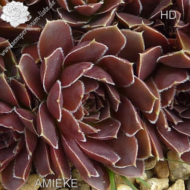 kleine Rosetten, Blätter oval, kurz bespitzt, dunkles Rotbraun, Blattränder silbern bewimpert
