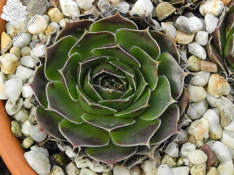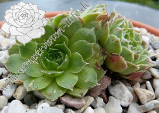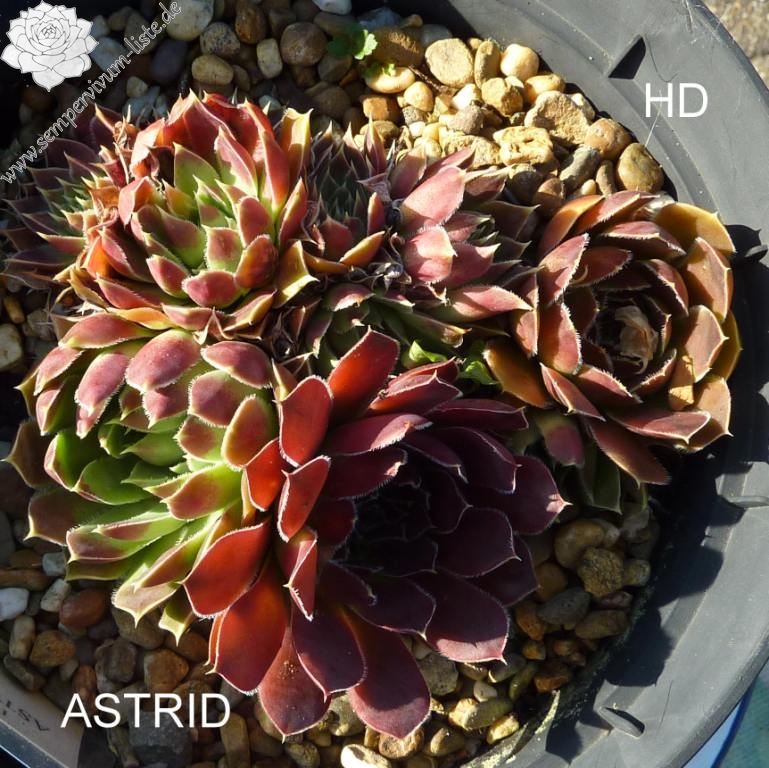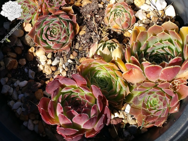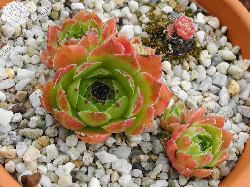 spitzblättrige Rosetten, außen purpur, innen grün, im Sommer in rötliche Töne übergehend