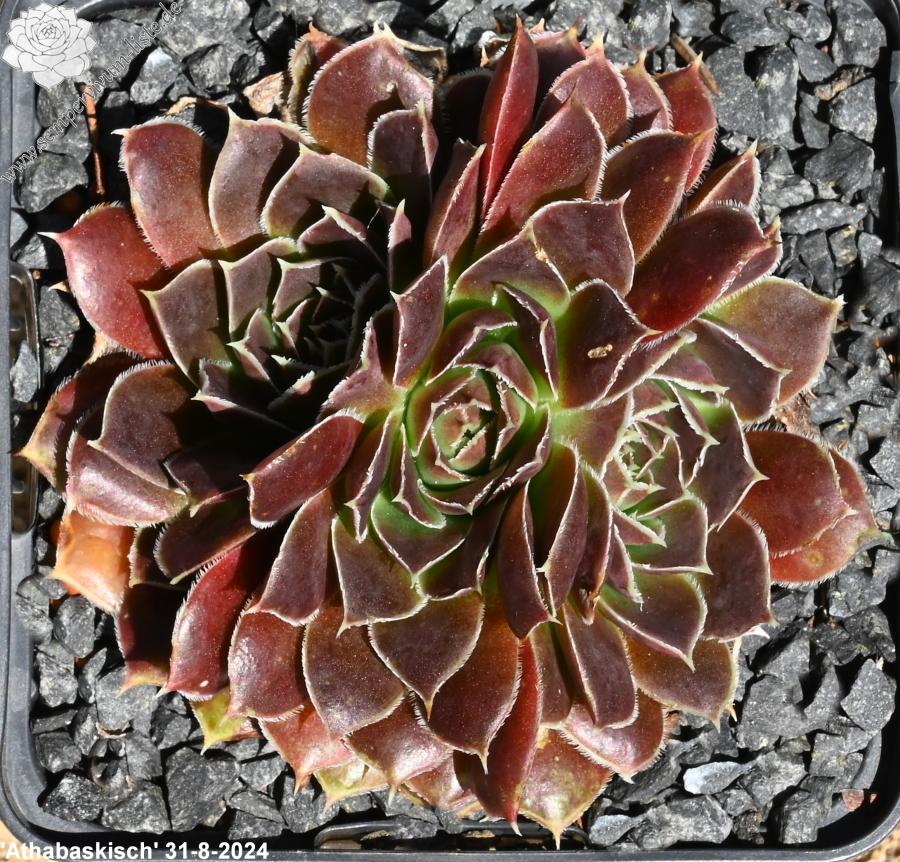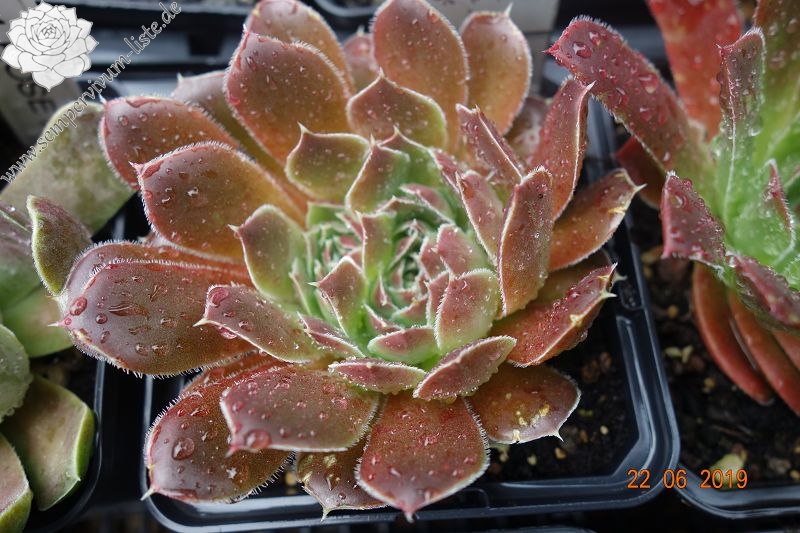 Rosetten bis 5 cm, Blätter eiförmig, kurz bespitzt, Herz helles Grün, Rest rosa - rot , Ränder bewimpert