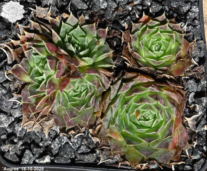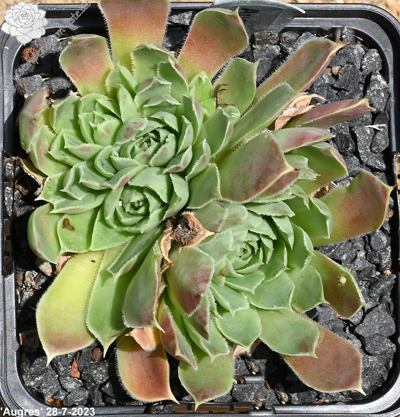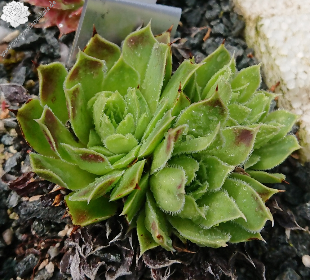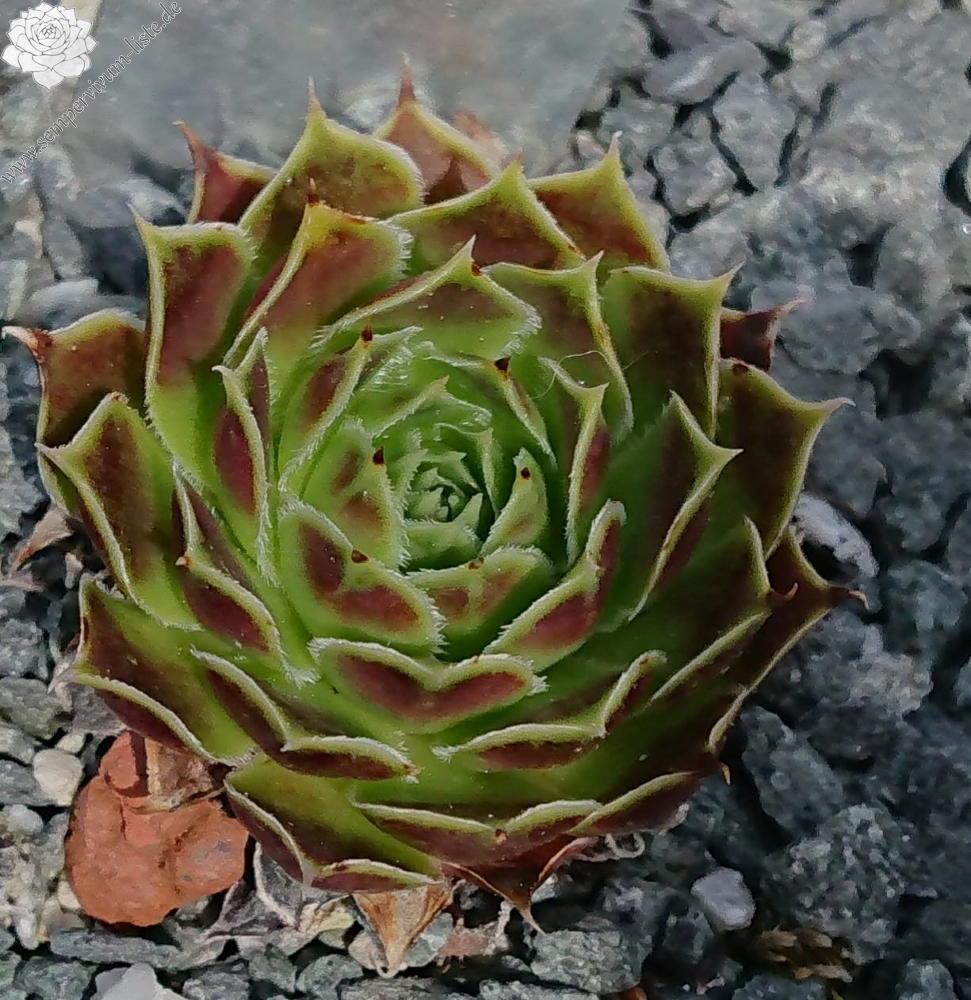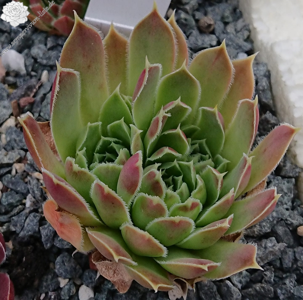 Rosetten bis 5 cm, Blätter oval, lang bespitzt, Basis hellgrün, Rest Mischtöne gelb-braun - rosa, Blattränder leicht bewimpert