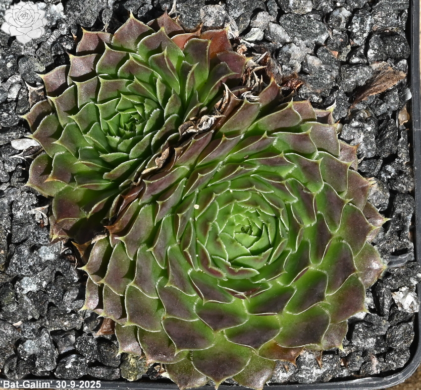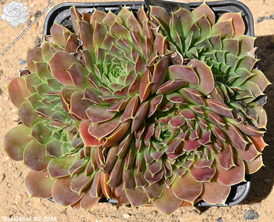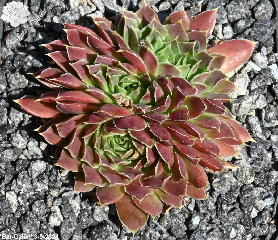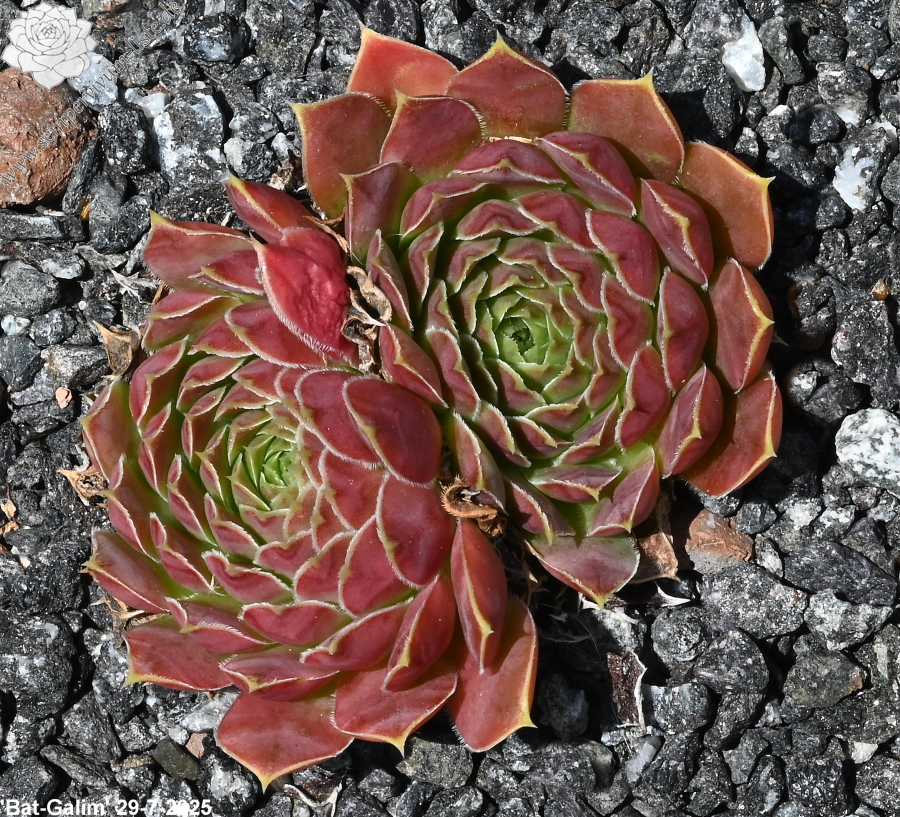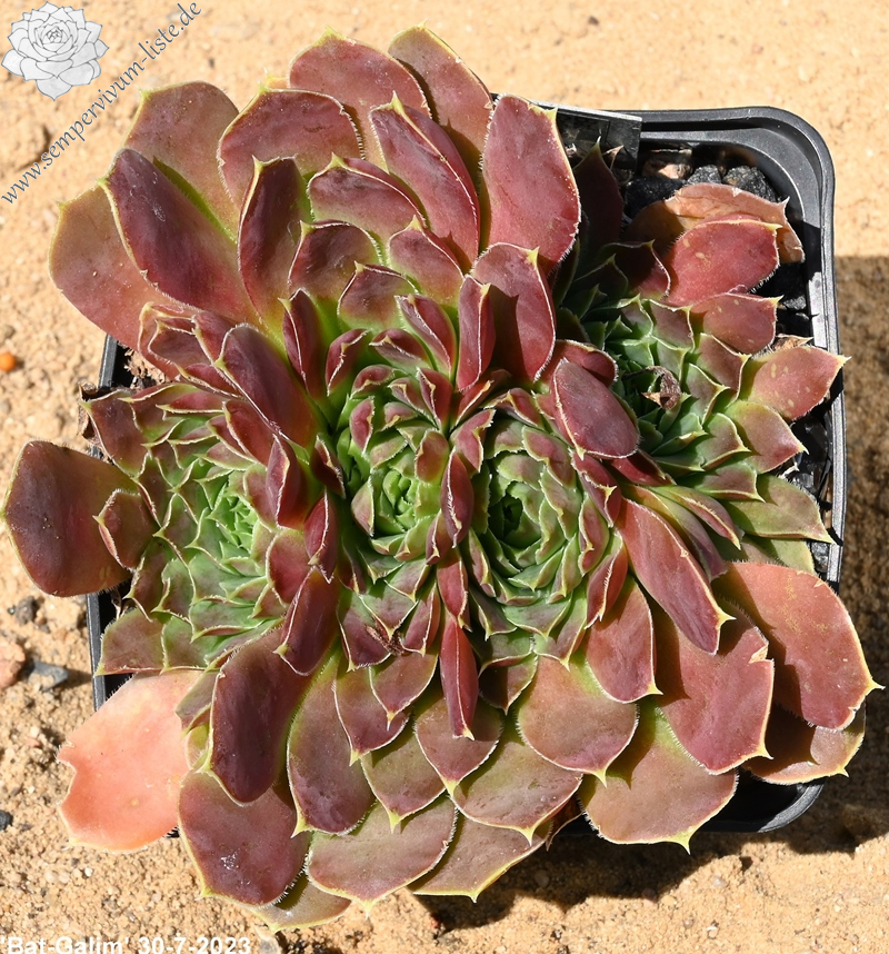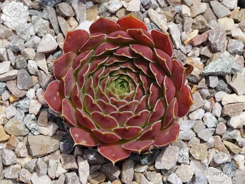 Rosetten bis 5 cm, Blätter keilförmig, kurz bespitzt, Herz helles Grün, Rest helles Rot, Blattränder gelb