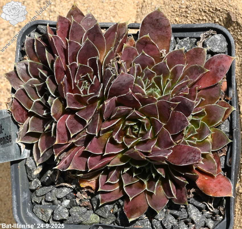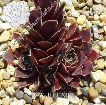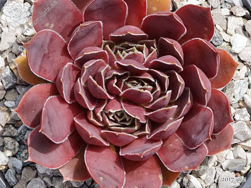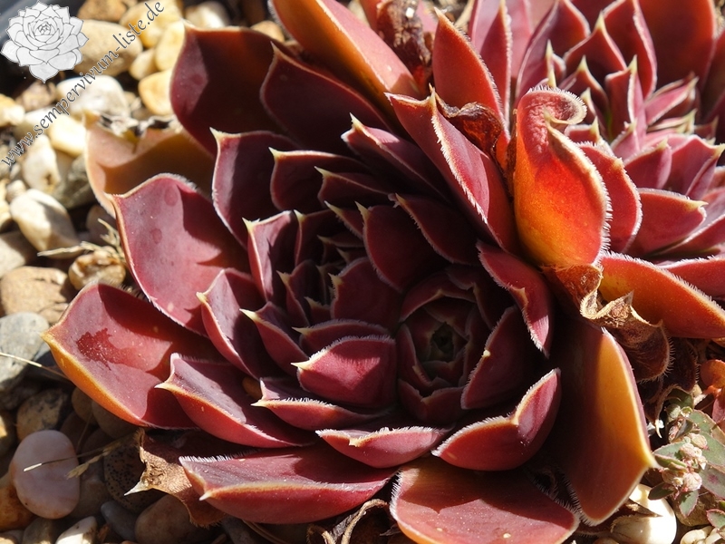 kleine Rosetten, Blätter oval, lang bespitzt, kastanienbraun - dunkles Rot, Ränder hell