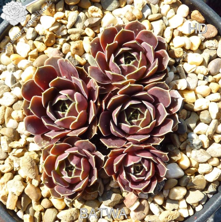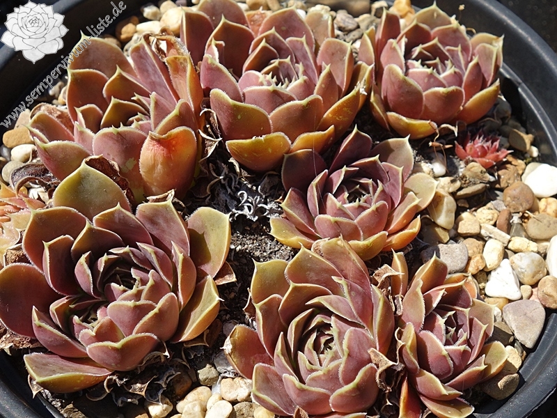 Rosetten bis 6 cm, Blätter spatelig, kurz bespitzt, rosa - helles Rot, Blattränder gelb, kurz bewimpert