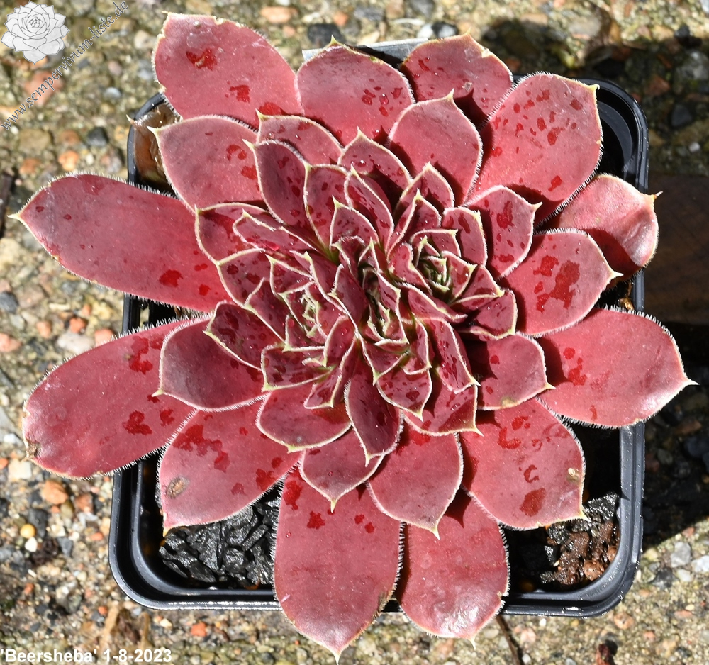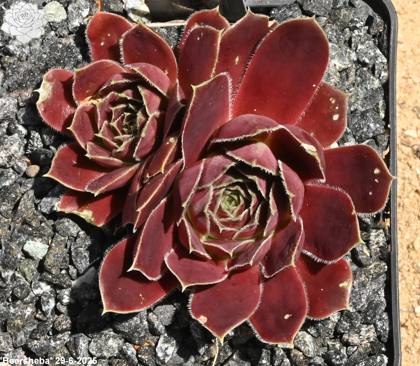 große offene Rosetten , Blätter linealisch, lang bespitzt, Basis helles Grün, Rest rosa - rot, Blattränder hell, leicht bewimpert
