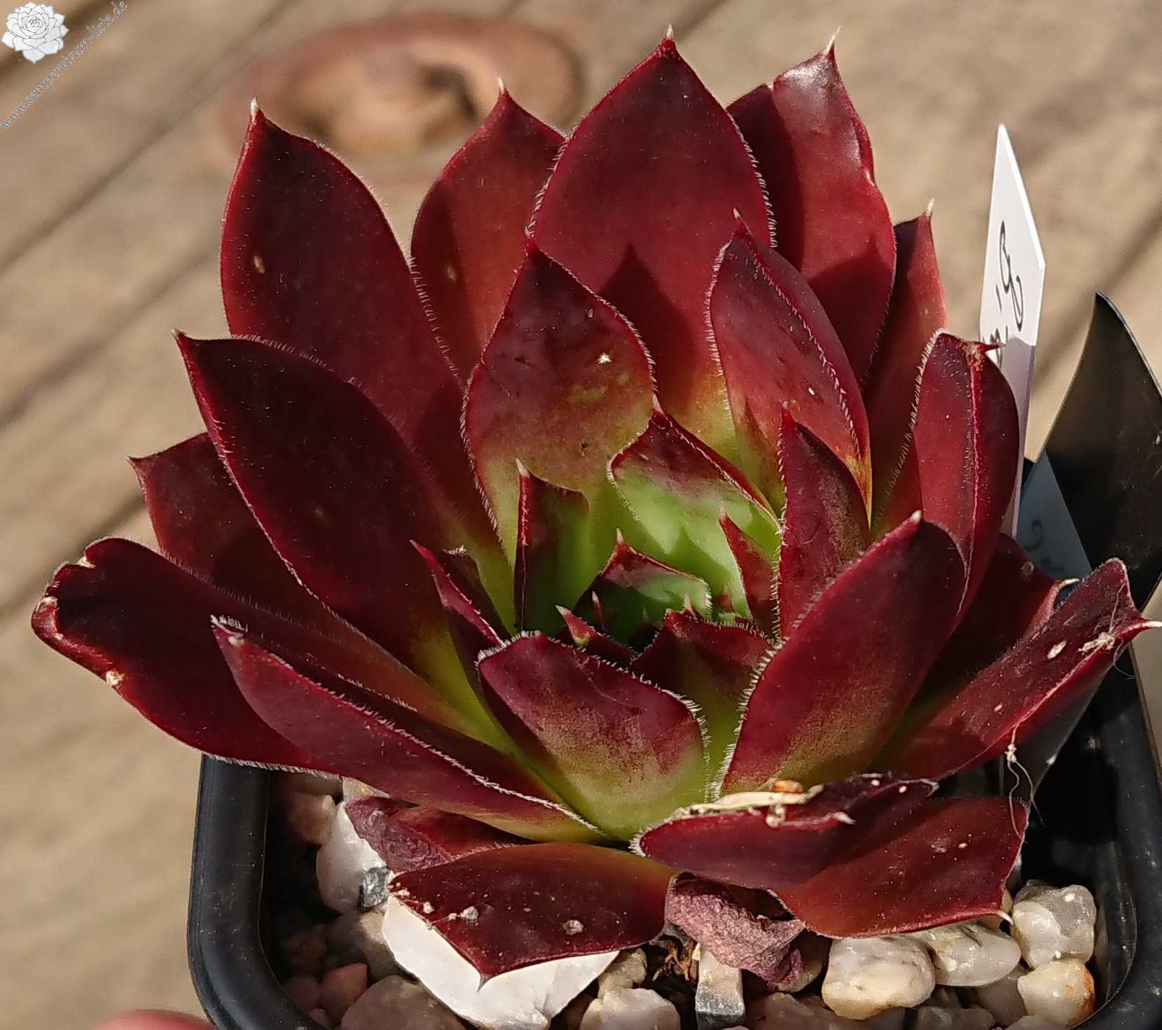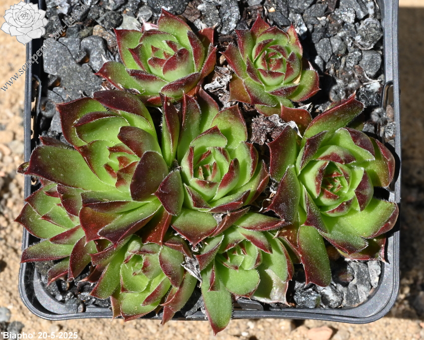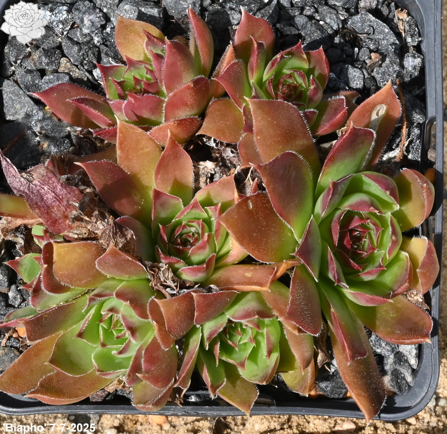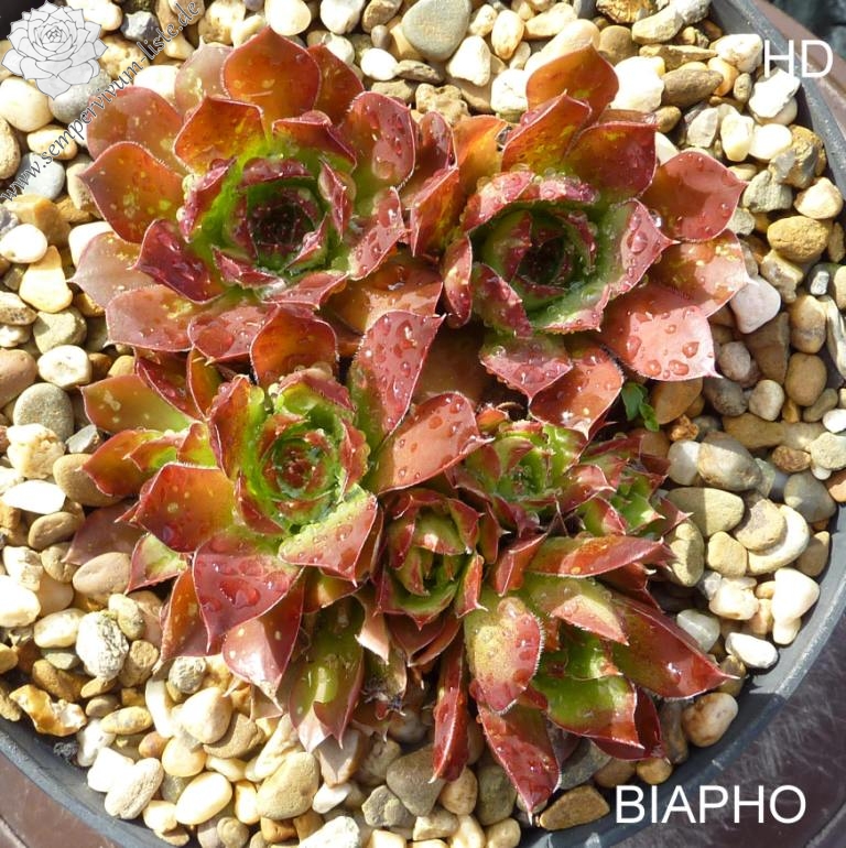 Rosetten bis 5 cm, Blätter verkehrt eiförmig, kurz bespitzt, Herz lindgrün, Rest rot - orange
