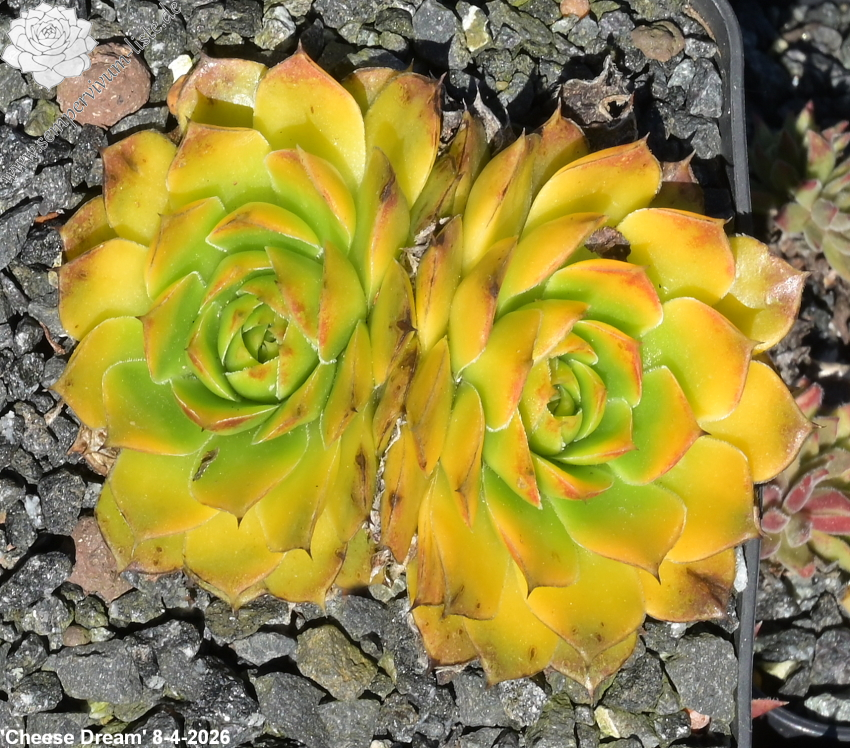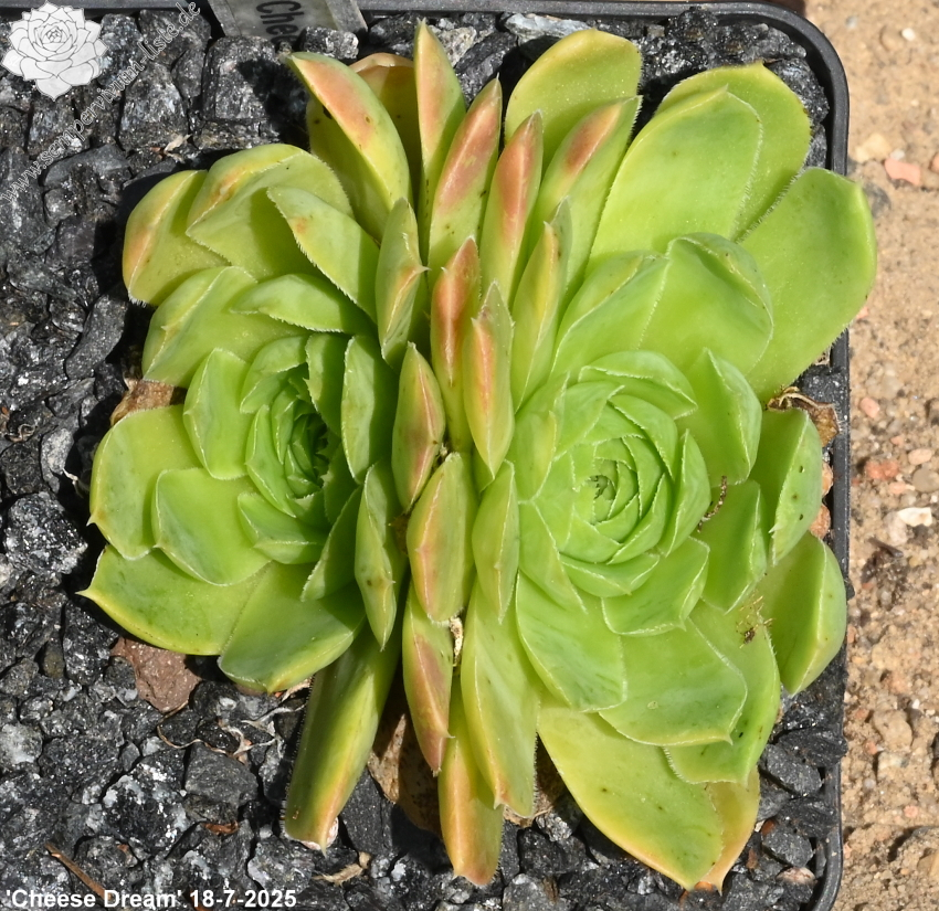 Ein neuer Jovibarba Sämling aus der ‚Cheese’-Serie, der über viele Jahre gute Eigenschaften gezeigt hat. Im Frühjahr besitzt er nur eine leichte orange Färbung an den Blattenden. Im Sommer sind die Pflanzen im Zentrum hellgrün, die Blattenden werden heller und gehen mehr ins Gelb über. Die Blattspitzen zeigen eine leichte orange Färbung. Es handelt sich um eine wüchsige, unempfindliche Pflanze, die sich gut teilen läst.