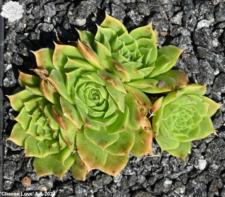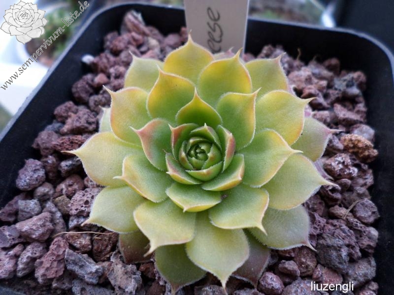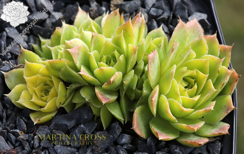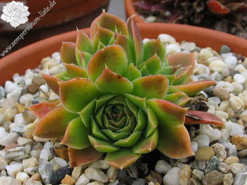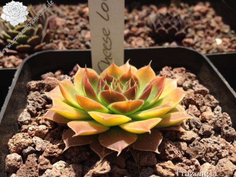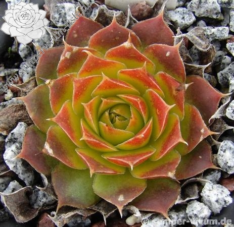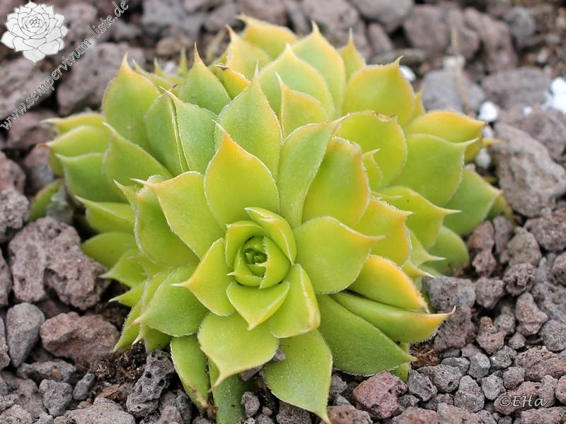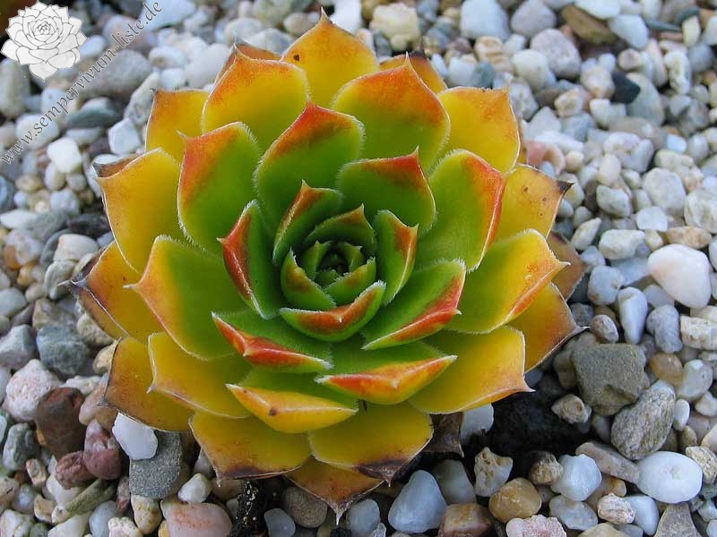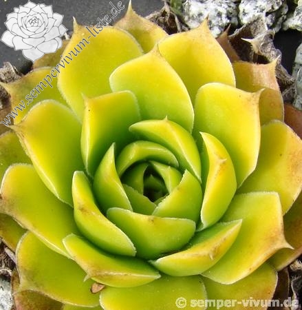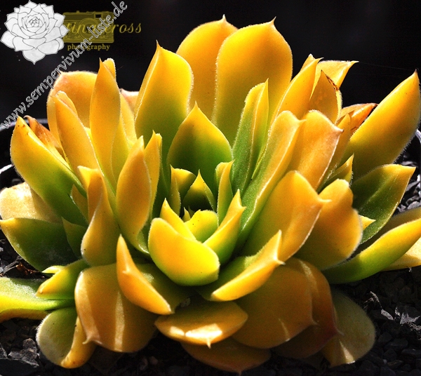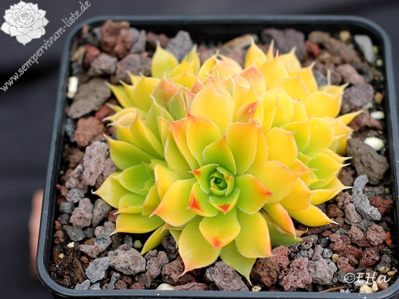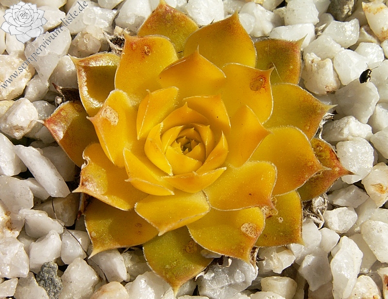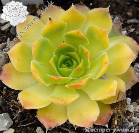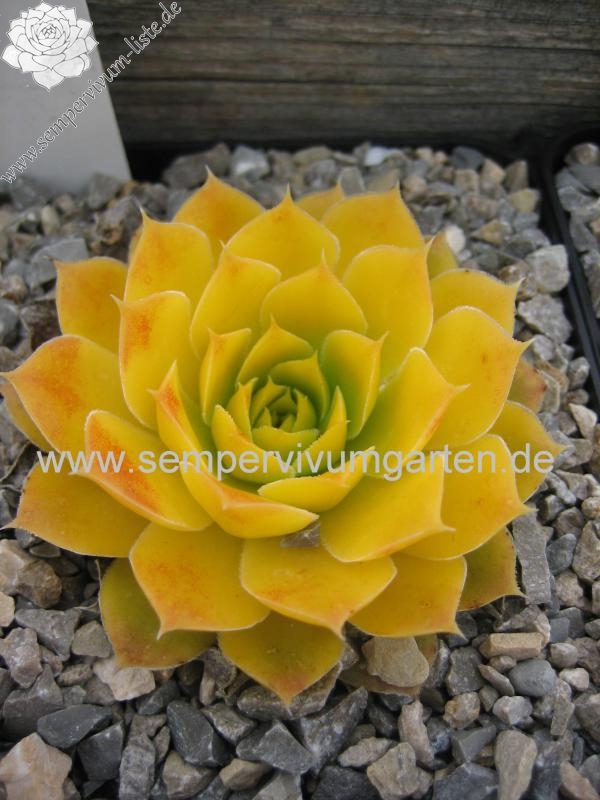 Besitzt sehr gute Eigenschaften. Die Rosetten sind fast ganz einheitlich gelb gefärbt. Nur an den Blattenden zeigen sich schwache orange Spuren. Im Rosettenzentrum hebt sich ein kleines grünes Herz deutlich ab. Im Frühjahr färben sich die Rosetten langsam von innen heraus grünlich. Eine wüchsige Pflanze, die sich gut teilen lässt.