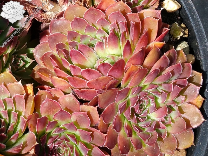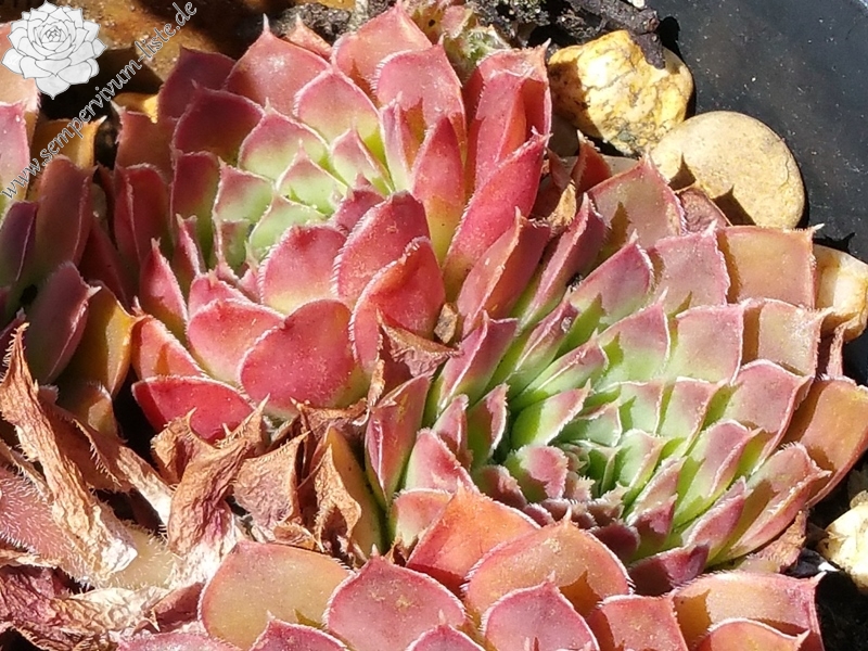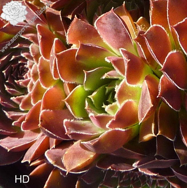Rosetten bis 8 cm, Blätter oval, bespitzt, helles grün an der Basis obere Blattdrittel helles rot, im Sommer in dunkles braun übergehend