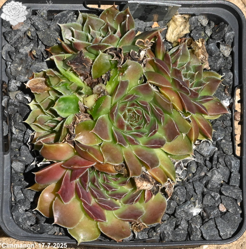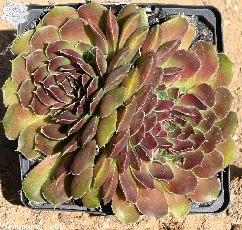 Die Sorte 'Cimmanon' aus den Niederlanden hat ihren eigenen Charme. Die triste Grundtönung der relativ großen Rosetten wird ab Sommer mit einem beeindruckendem Rosaviolet überzogen. Auch als 'Cinnamon' in Kultur.