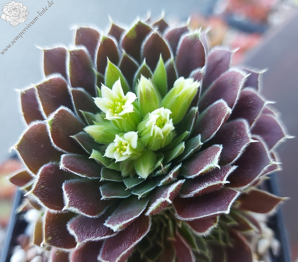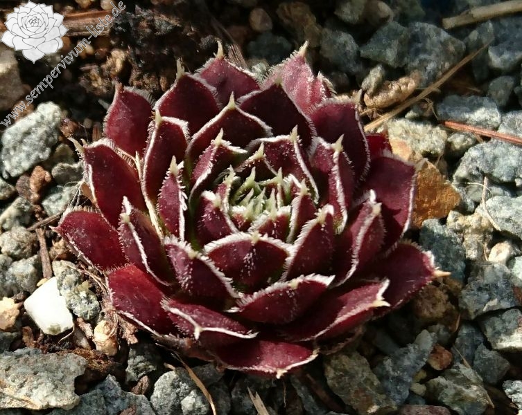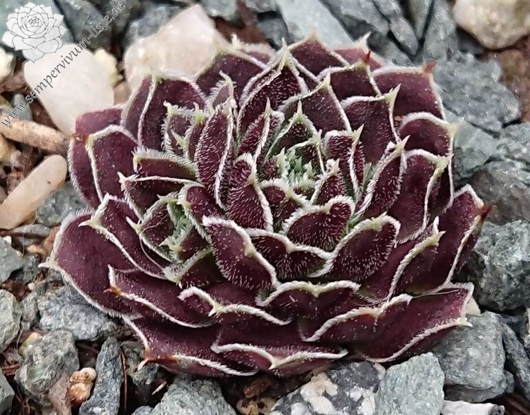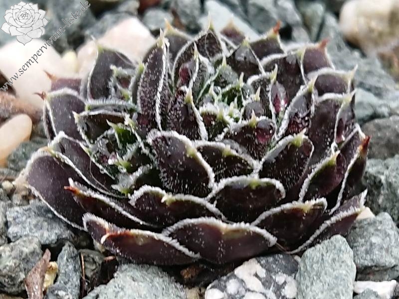 Rosetten bis 8 cm, Blätter oval, kurz bespitzt, signalviolett - purpurviolett, Blattränder grünlich, silbrig bewimpert