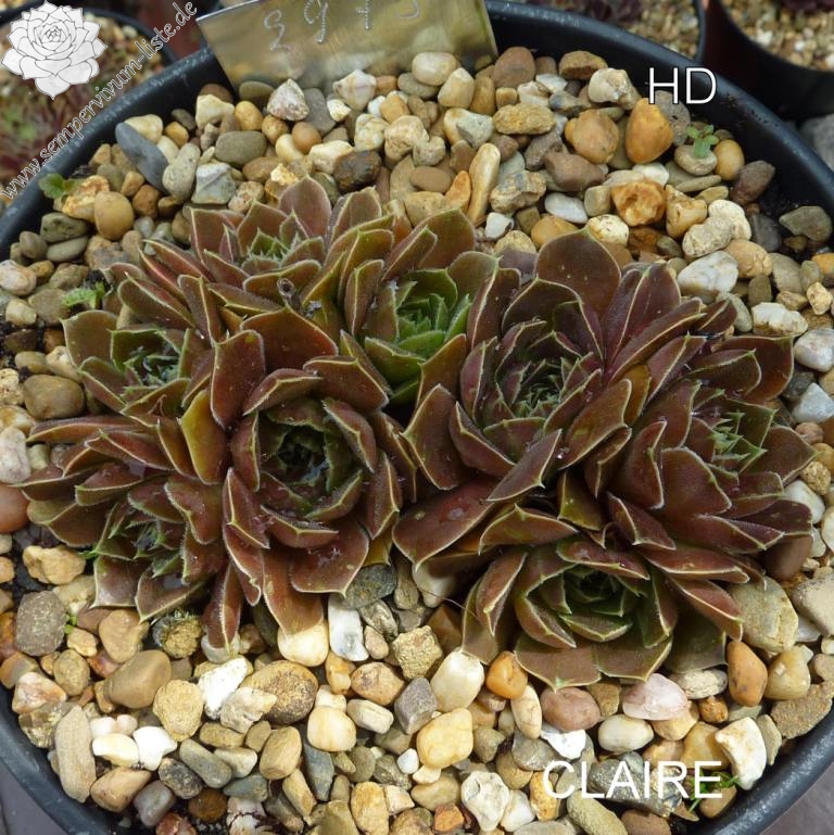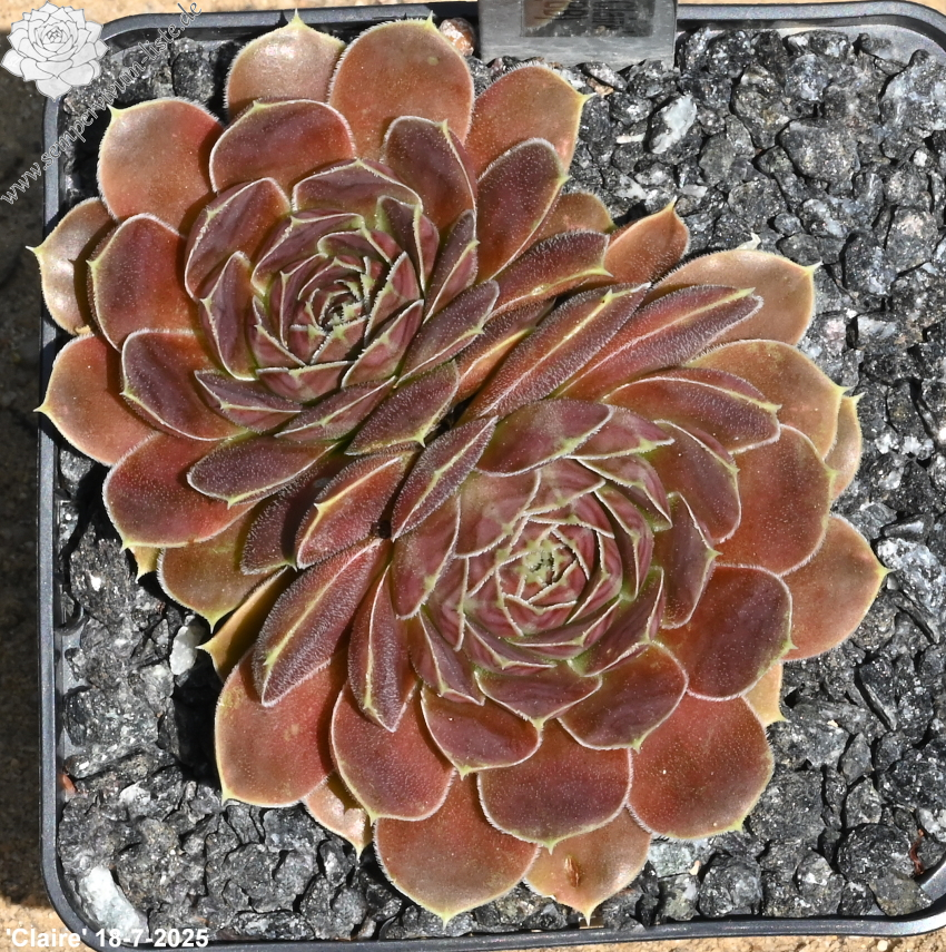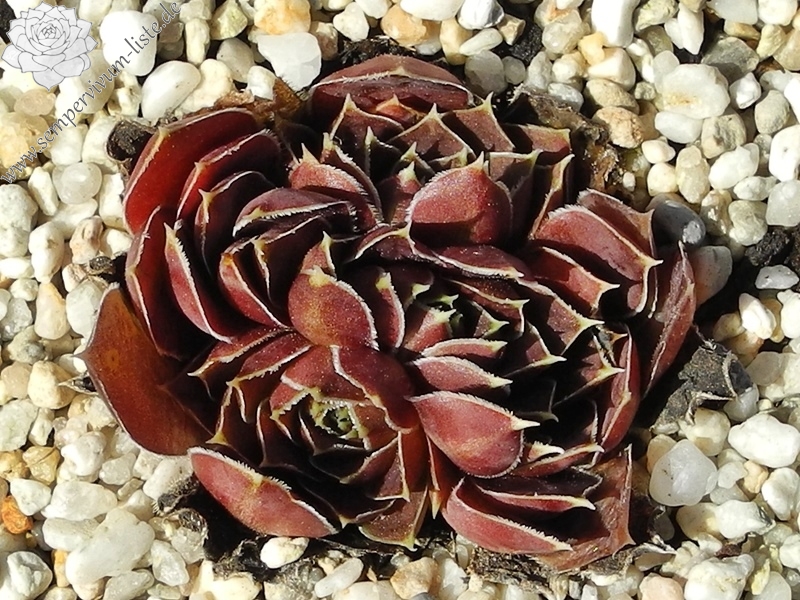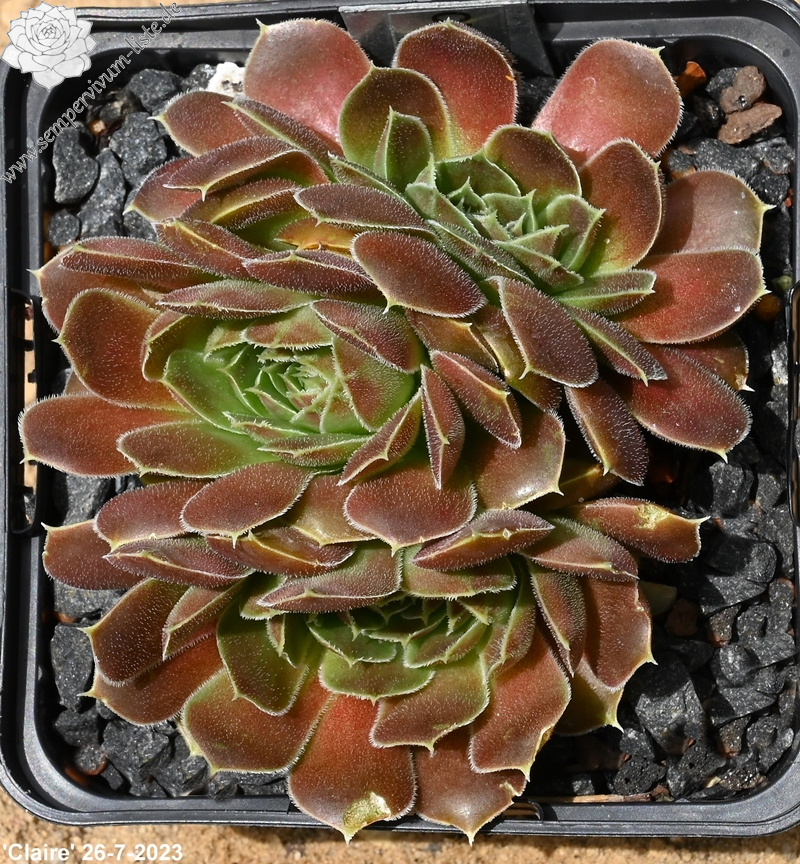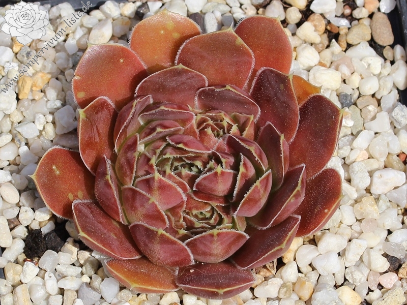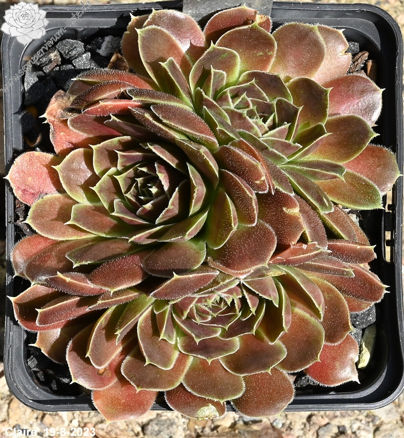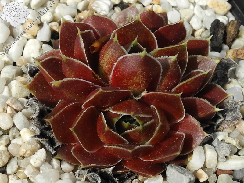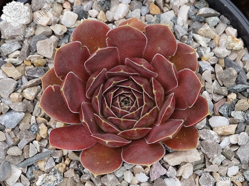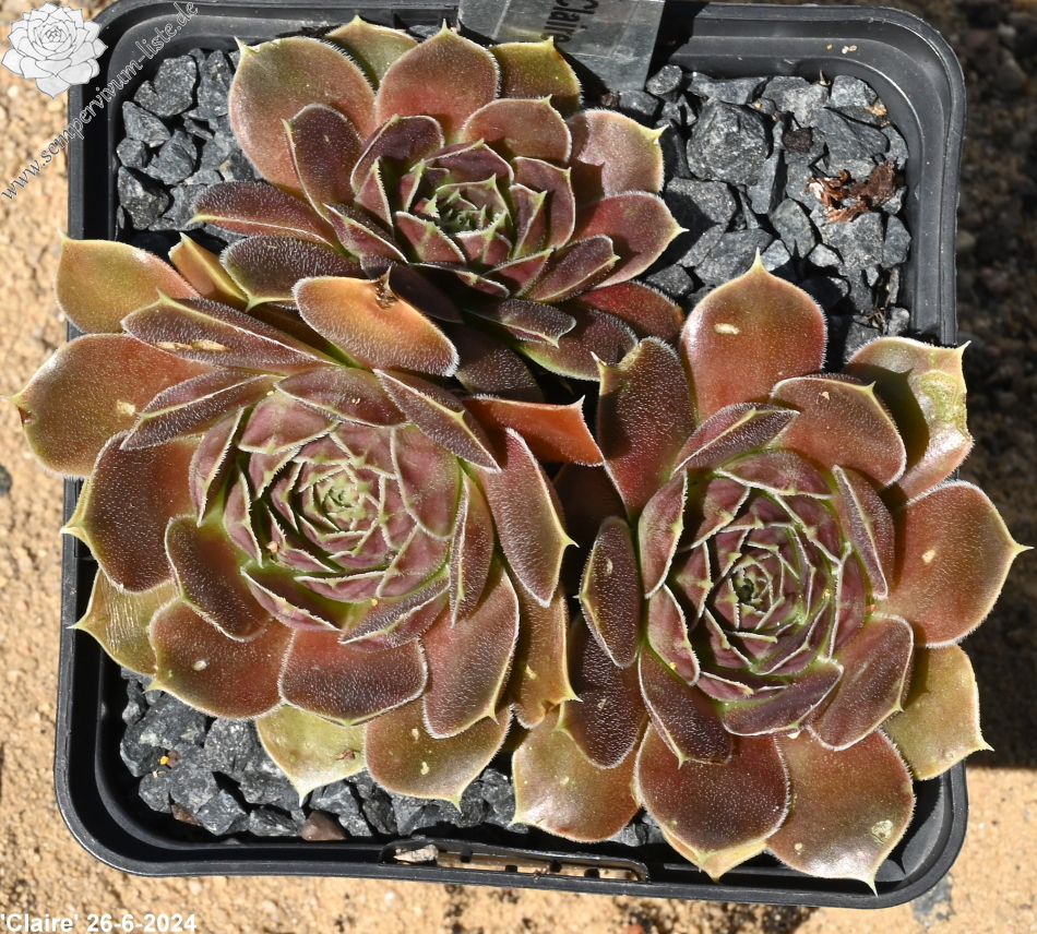 Rosetten bis 6 cm, samtige Substanz, Blätter oval, lang bespitzt, Basis helles Grün, Rest dunkles Braunrot, Blattränder grünlich, bewimpert