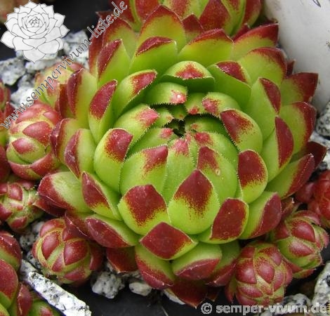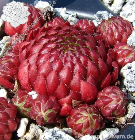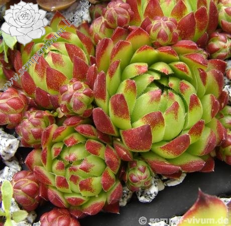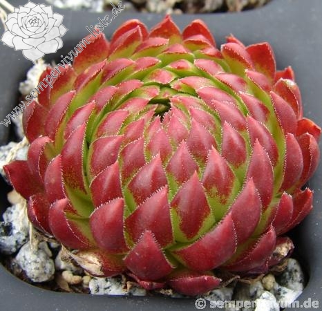 Die neuere Sorte formt im Verhältnis zu ihren Verwandten relativ große Rosetten. Im Frühjahr zeigen die grünen Blätter kontrastreiche, rotbraune Spitzen. Zum Sommer verfärbt sich die gesamte Pflanze in ein farbenprächtiges Erdbeerrot.