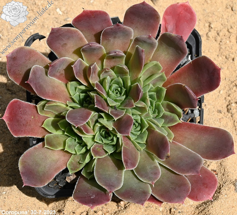 Die Rosetten erstrahlen in violetten bis purpurfarbenen Tönen. S. heuffelii 'Coropuna' stammt aus Deutschland und wurde im Jahre 2004 eingeführt. Er wurde benannt nach dem höchsten Vulkan in Peru.