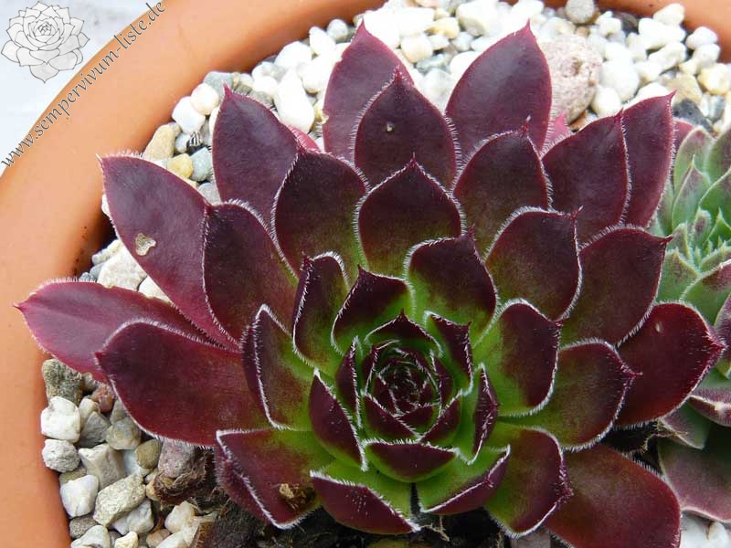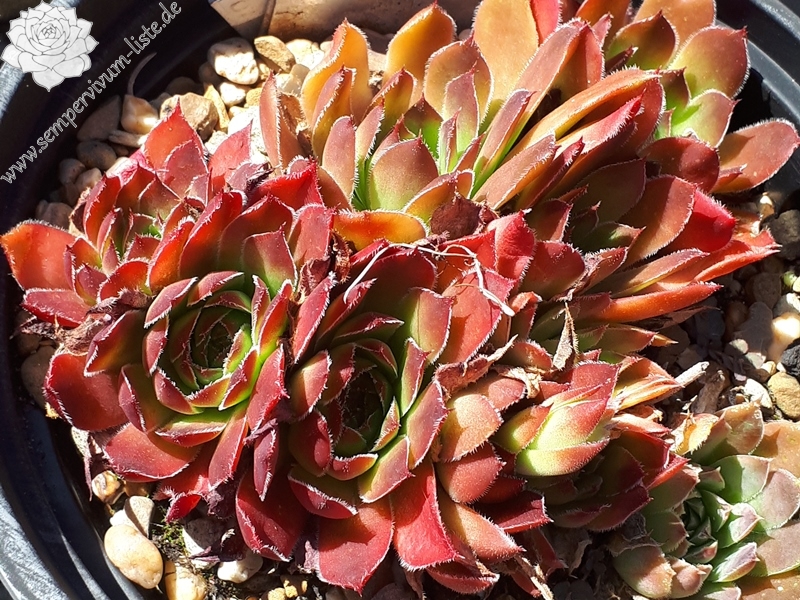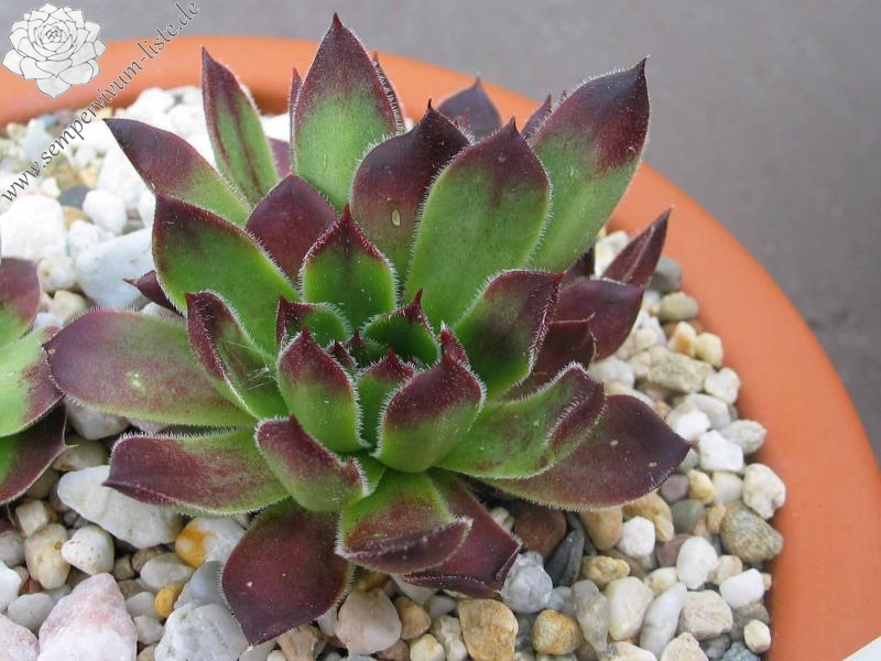 Rosetten bis 4 cm, Blätter linealisch, Basis hellgrün, dunkelrote Spitzen, Blattränder silbern bewimpert