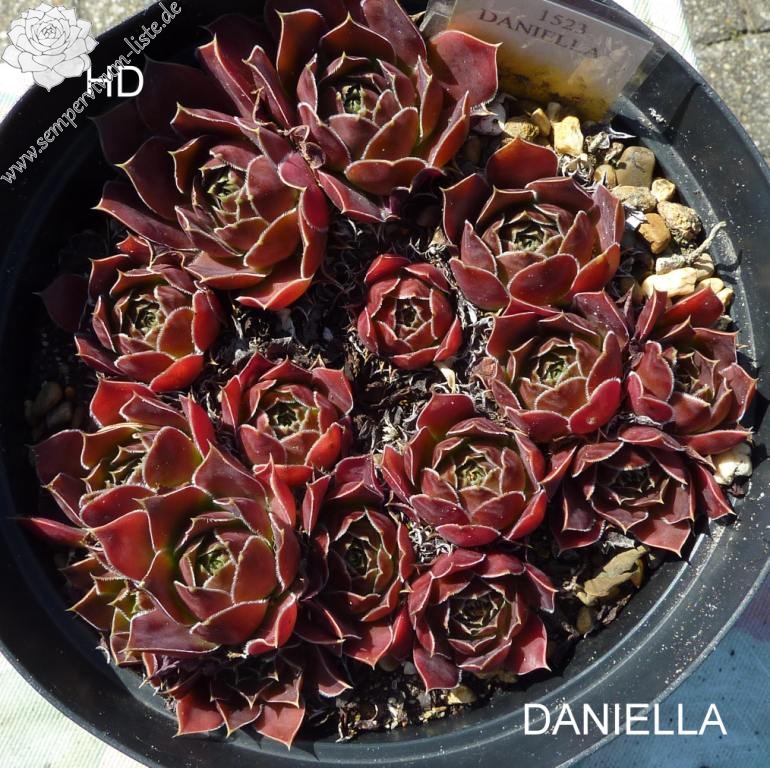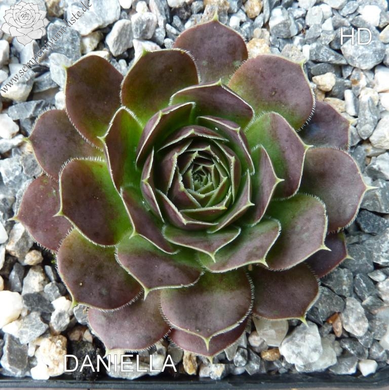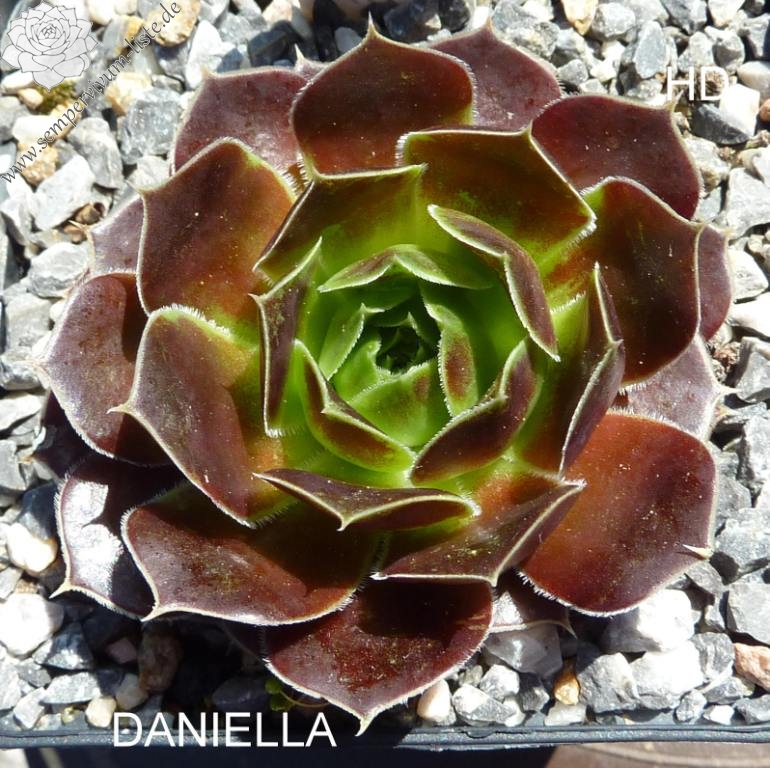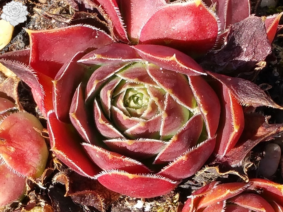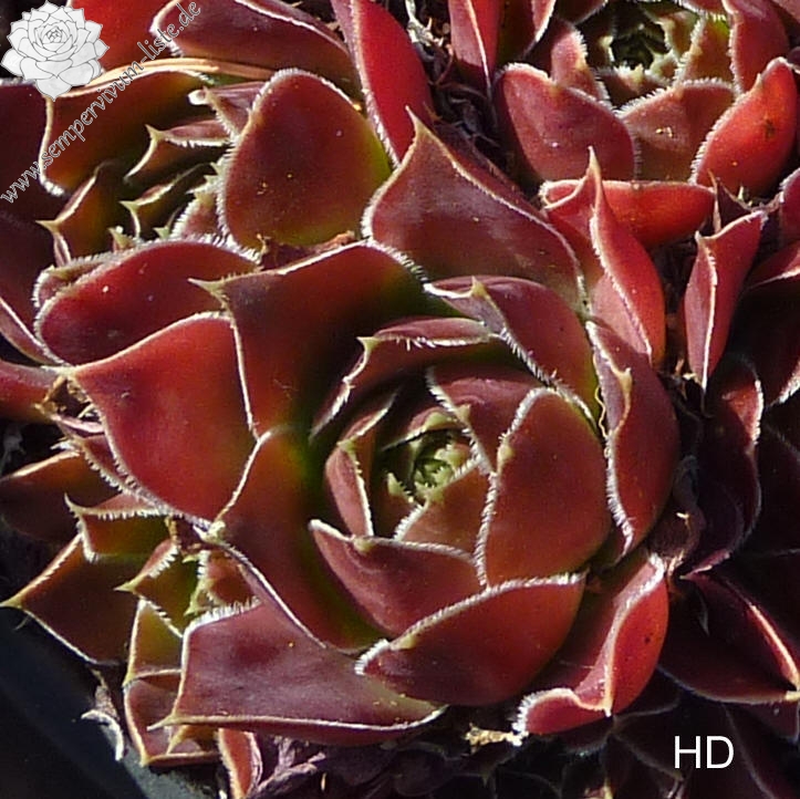 kompakte Rosetten, Blätter kurz keilförmig, lang bespitzt, kräftiges dunkles rot, silbrige Blattwimpern