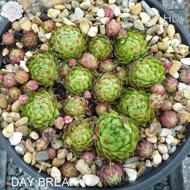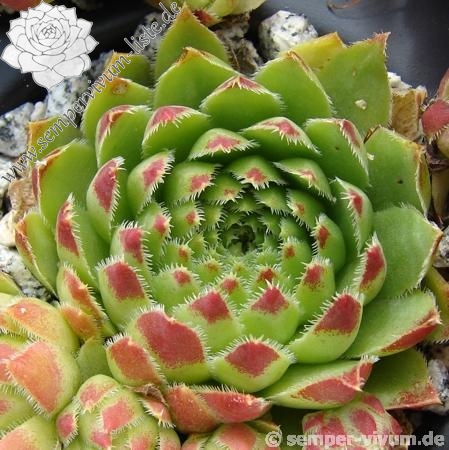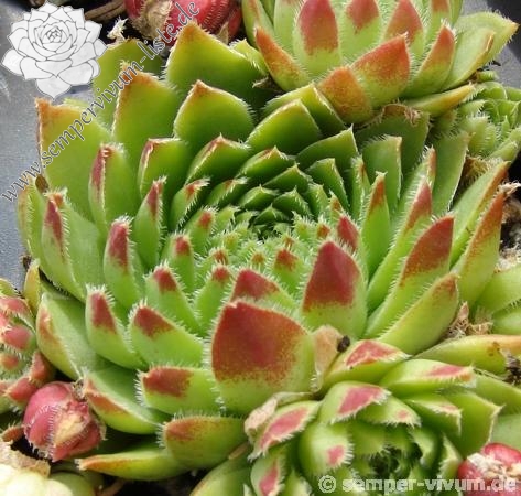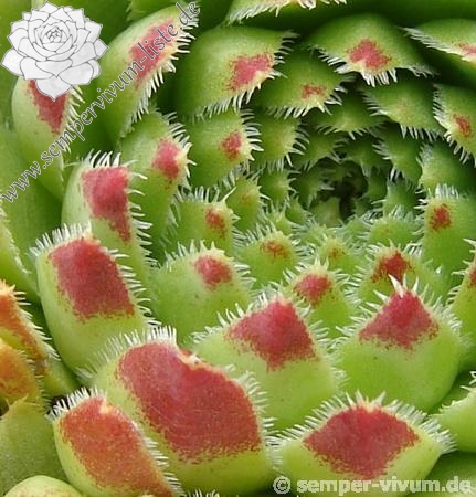 Die apfelgrünen Rosetten tragen eher spitze Blätter mit vielen weißen Randwimpern bestückt. Ab Sommer färben sich die Blattspitzen samt deren Unterseiten in Rosa.