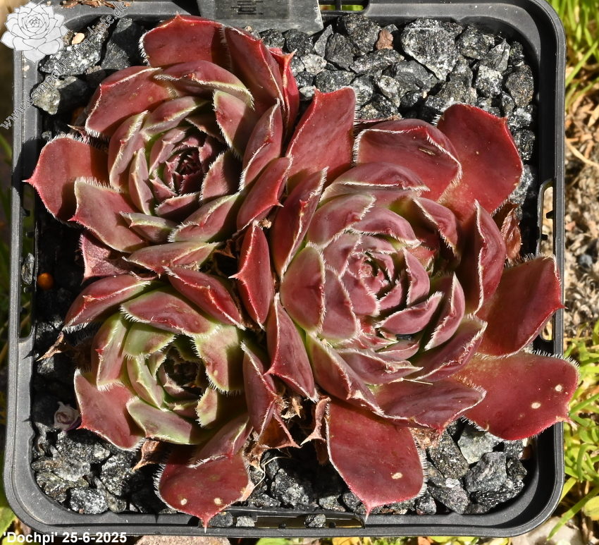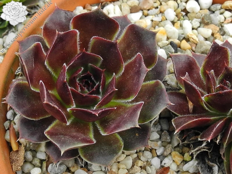 Eine belgische Züchtung mit mittelgroßen Rosetten in violettpurpurnen und olivgrünen Farben.
