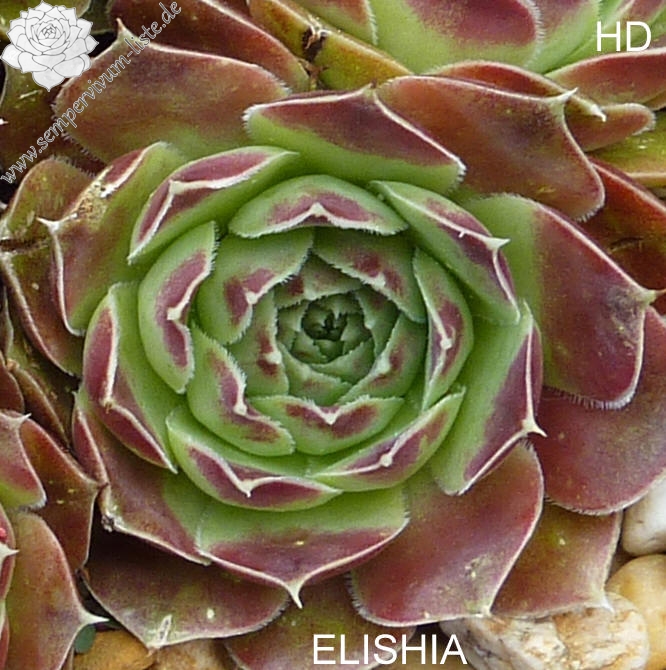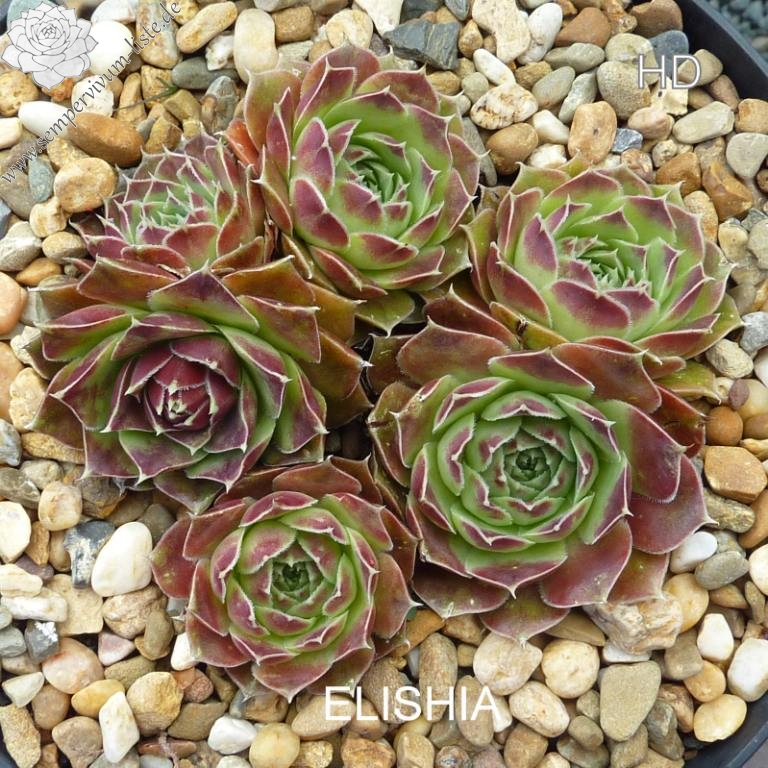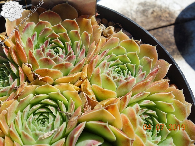 Rosetten bis 5 cm, Blätter rundlich, kurz bespitzt, Basis hellgrün, obere Blattdrittel braunrot