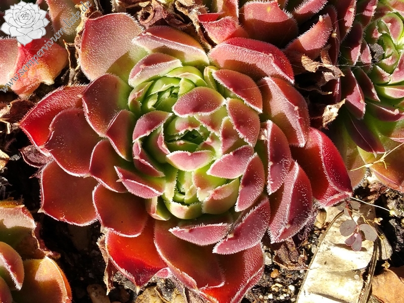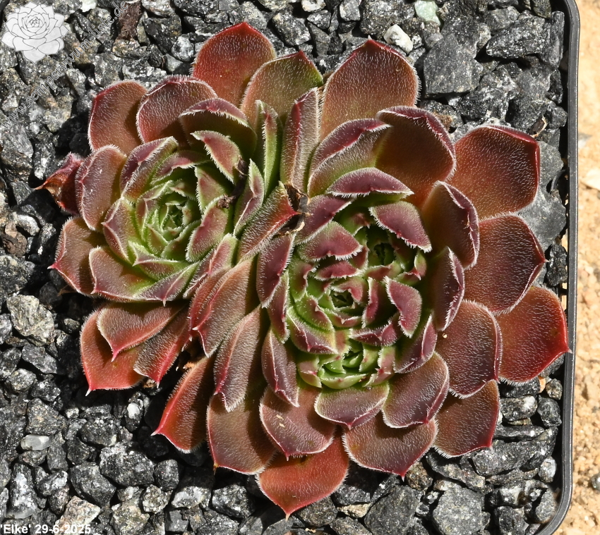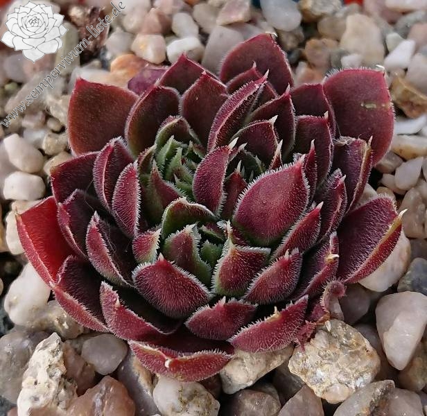 Rosetten bis 6 cm, Blätter linealisch, lang bespitzt, samtige Substanz, Herz dunkles Grün, Rest dunkles Braun - Lila, Blattränder silbrig bewimpert