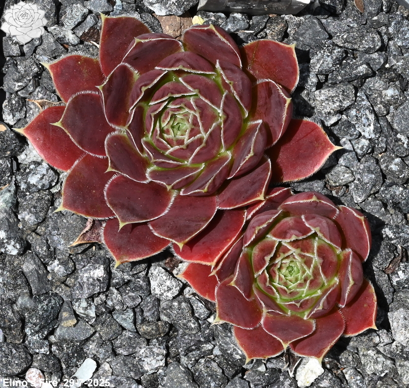 Rosetten bis 5 cm, Blätter linealisch, lang bespitzt, dunkles Rot, Blattränder hell, leicht bewimpert