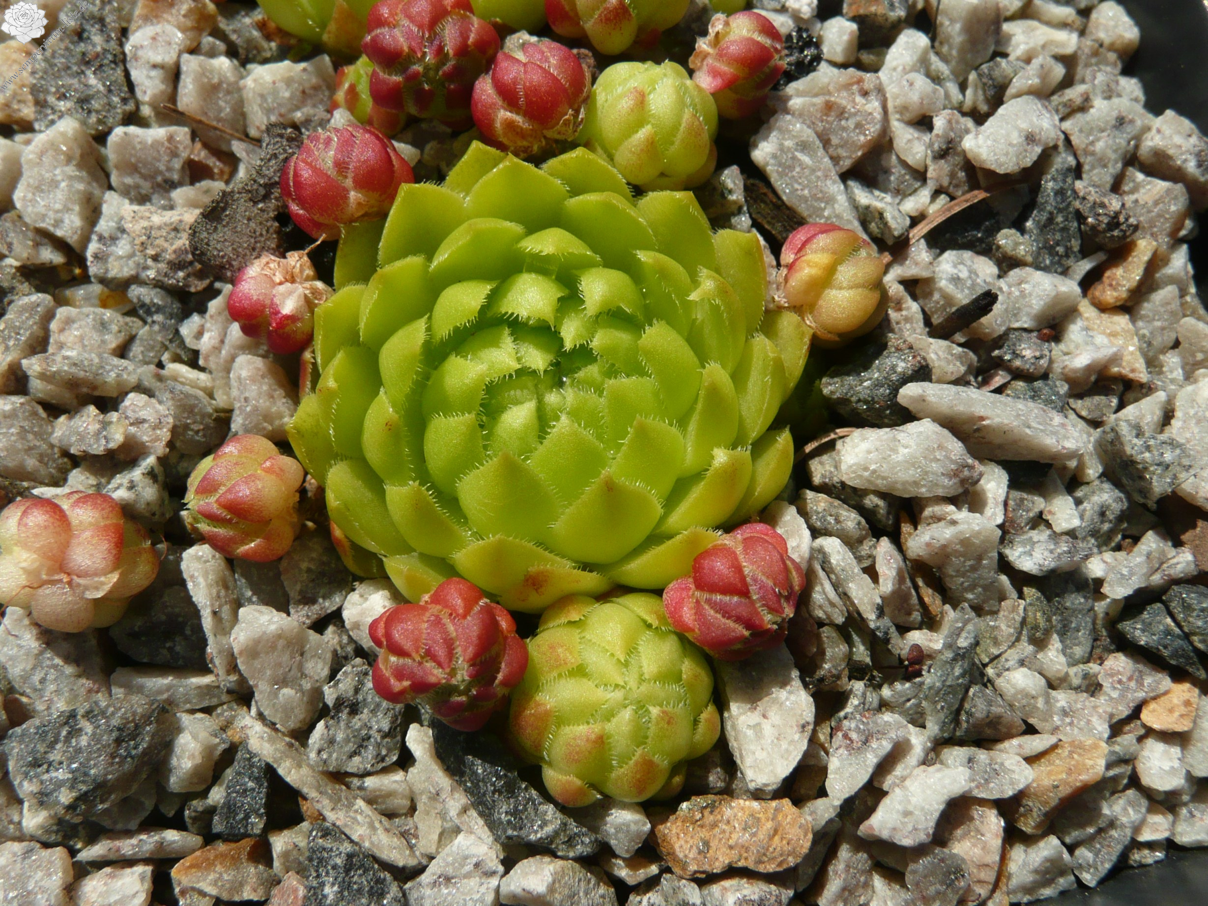 Die amerikanische Hybride aus S. globiferum ssp. hirtum mit S. globiferum ssp. globiferum formt sehr kugelige Rosetten in frisch grüner Farbe.