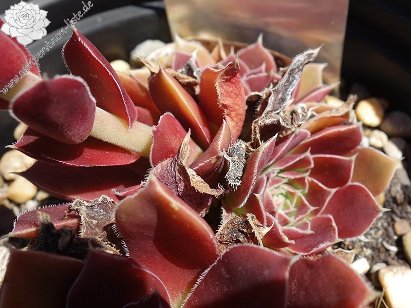 Rosetten bis 8 cm, spatelige Blätter, kurz bespitzt, dunkles Weinrot, Blattränder hell bewimpert