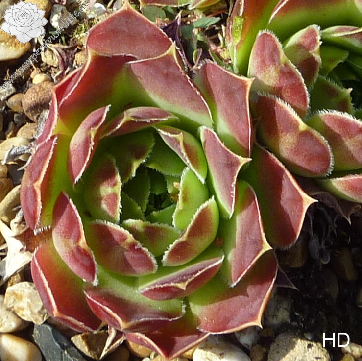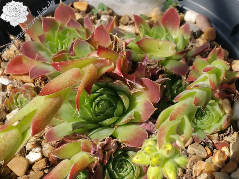 kleine Rosetten, keilförmige Blätter, lang bespitzt, Herz hellgrün, Rest leuchtendes Rot, helle Blattränder