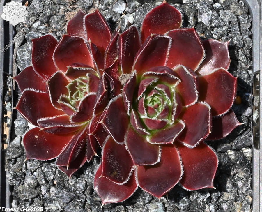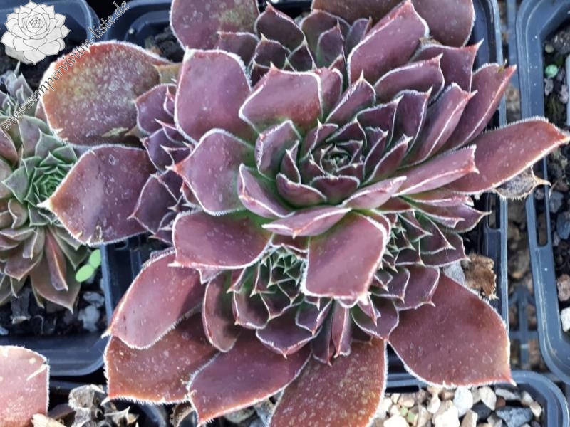 Rosetten bis 6 cm, Blätter oval, lang bespitzt, weinrot - schwarzrot, Blattränder hell