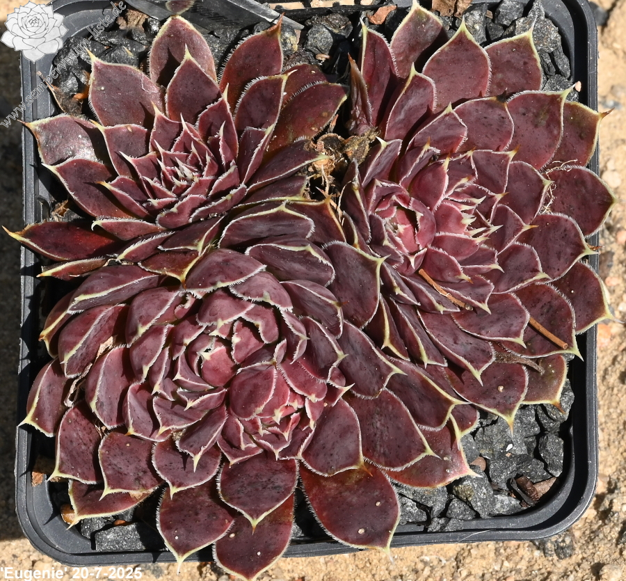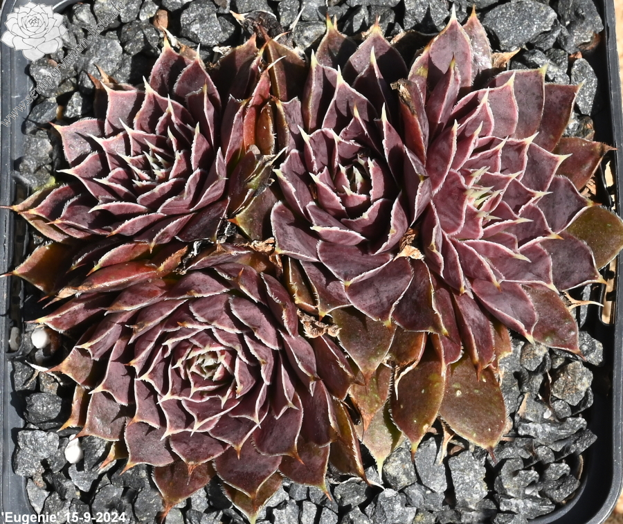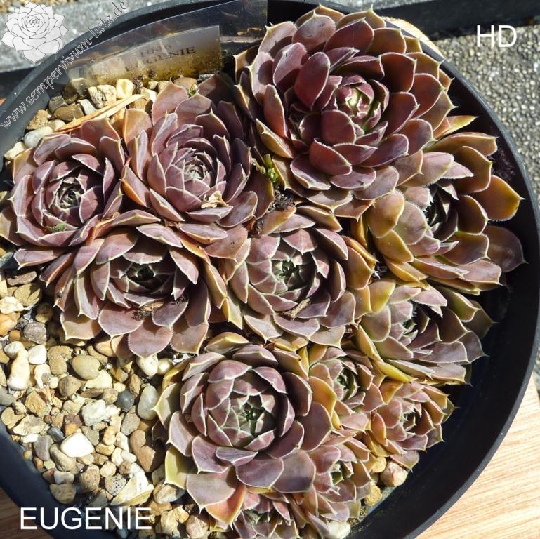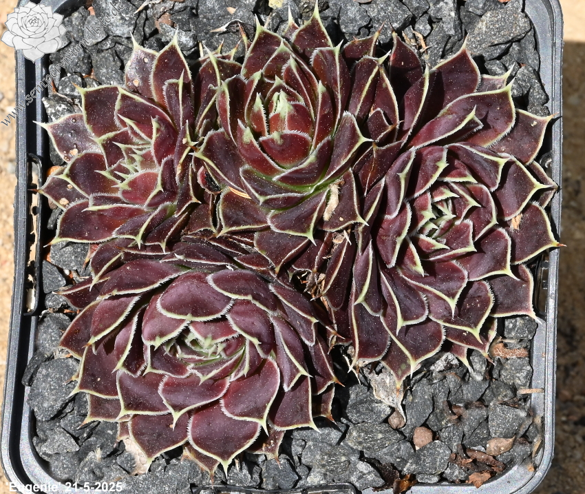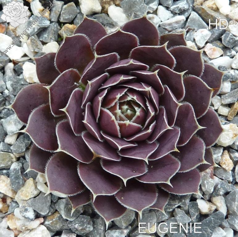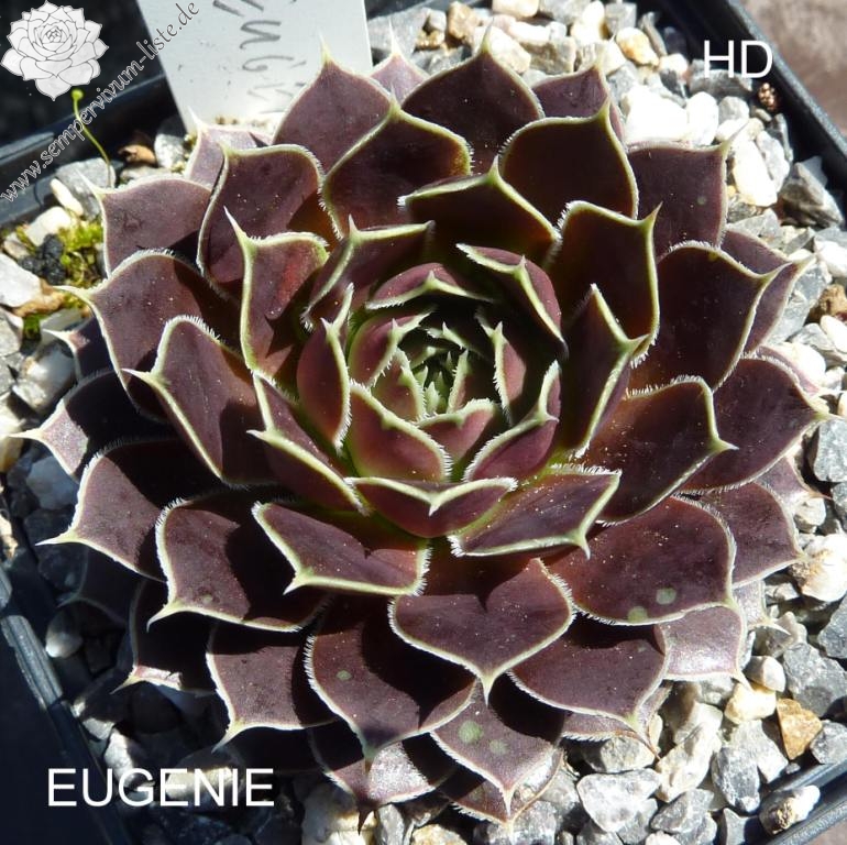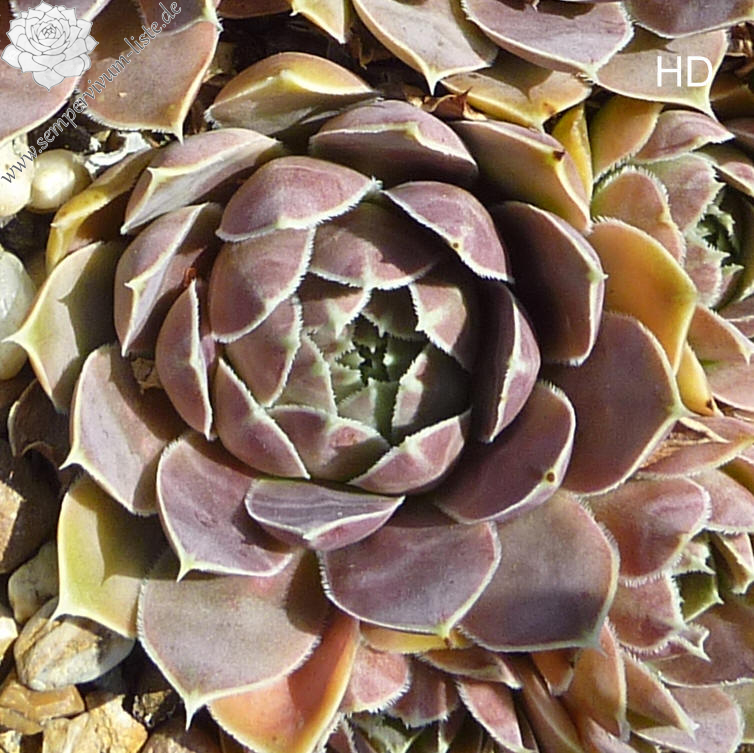 Rosetten bis 6 cm, ovale Blätter, lang bespitzt, trübes Lila, Blattränder hell bewimpert