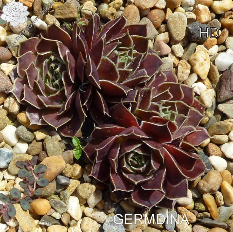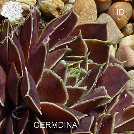 kleine Rosetten, Blätter oval, kurz bespitzt, purpurrot - weinrot, Blattränder hell