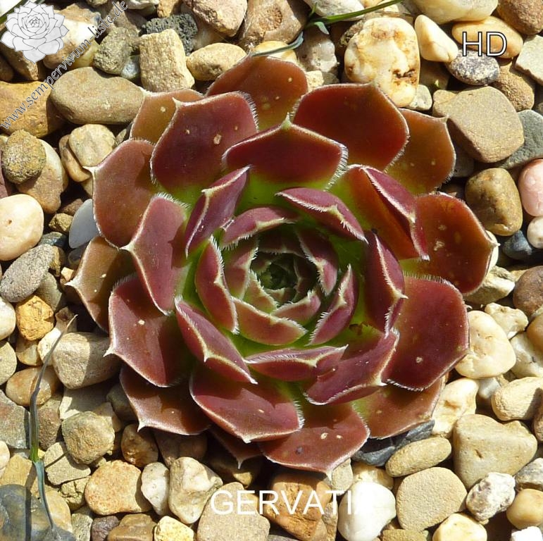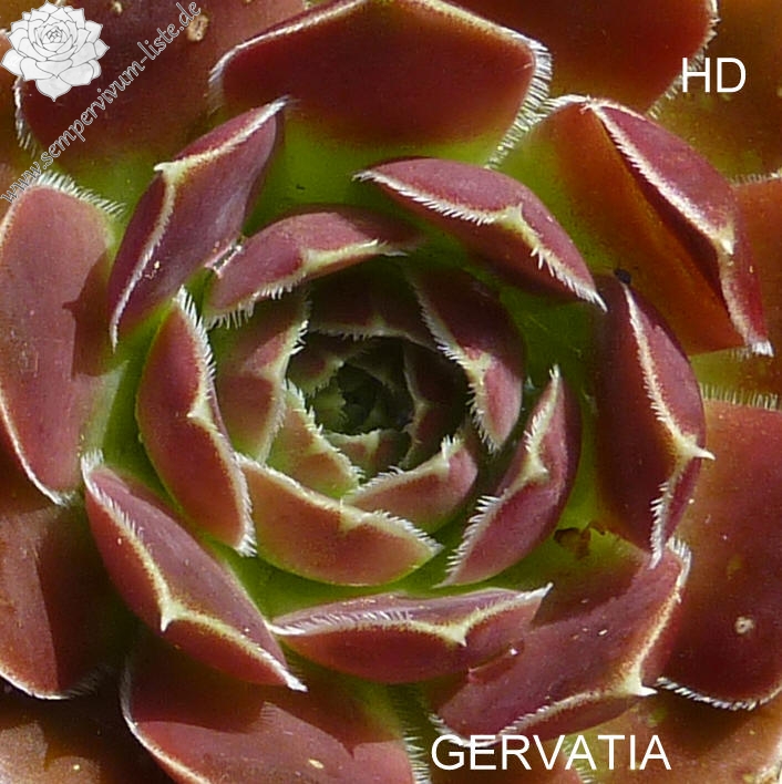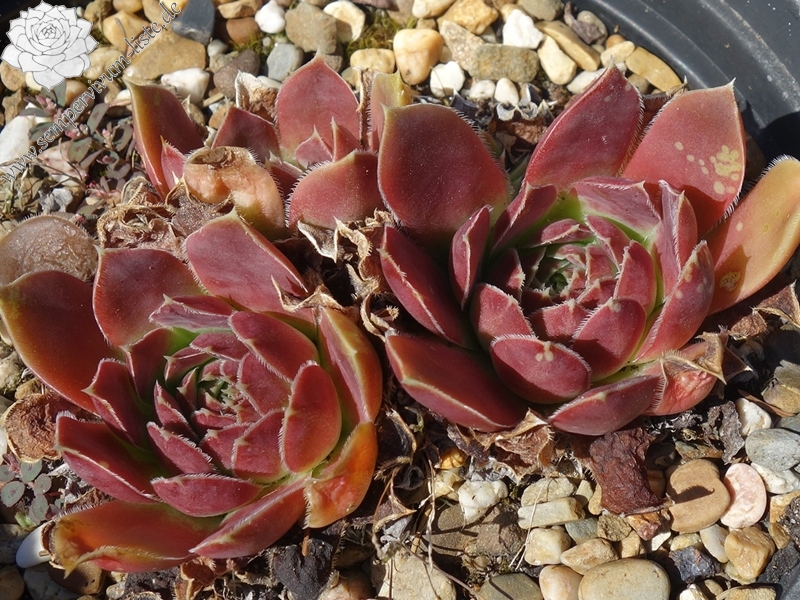 kleine Rosetten, Blätter breit keilförmig, kurz bespitzt, Herz hellgrün, Rest oxidrot - braunrot, Blattränder bewimpert