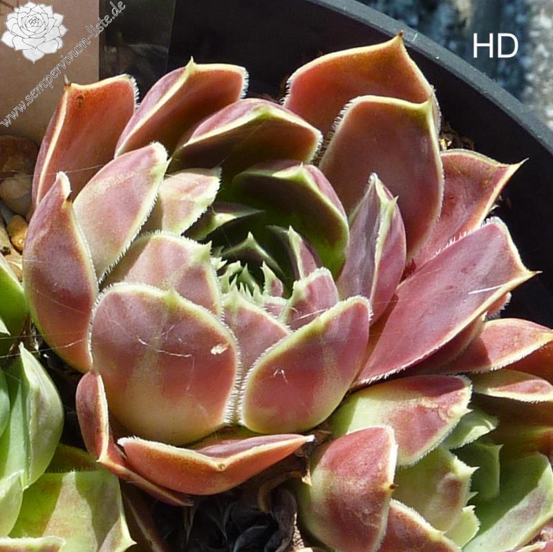 große Rosetten, Blätter oval, lang bespitzt, Mischtöne hellgrün, altrosa - hellrot, Blattränder hell, bewimpert