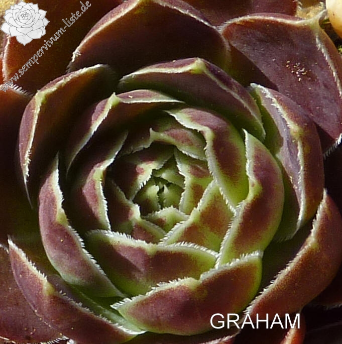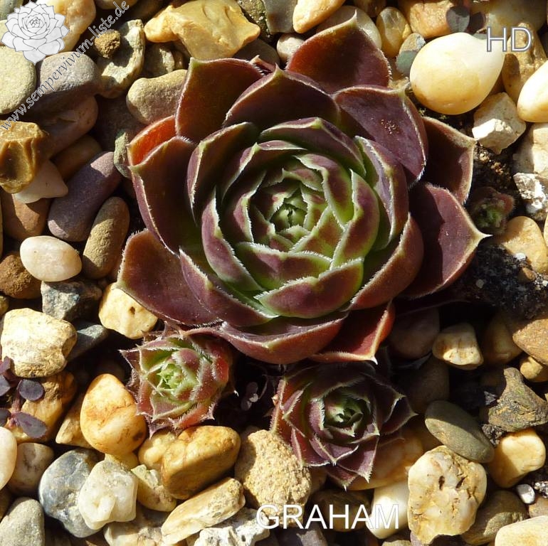 kleine Rosetten, Blätter rundlich, kurz bespitzt, Basis hellgrün, Rest oxidrot - bordeauxviolett, Blattränder bewimpert