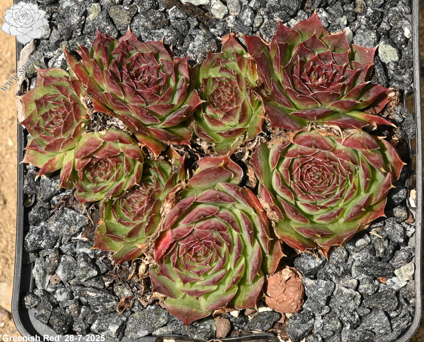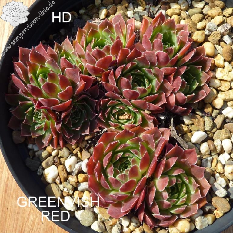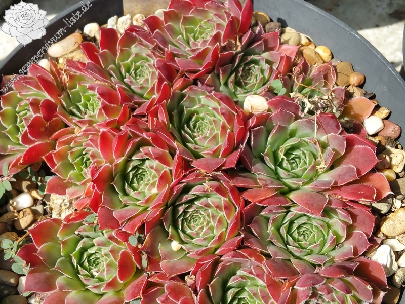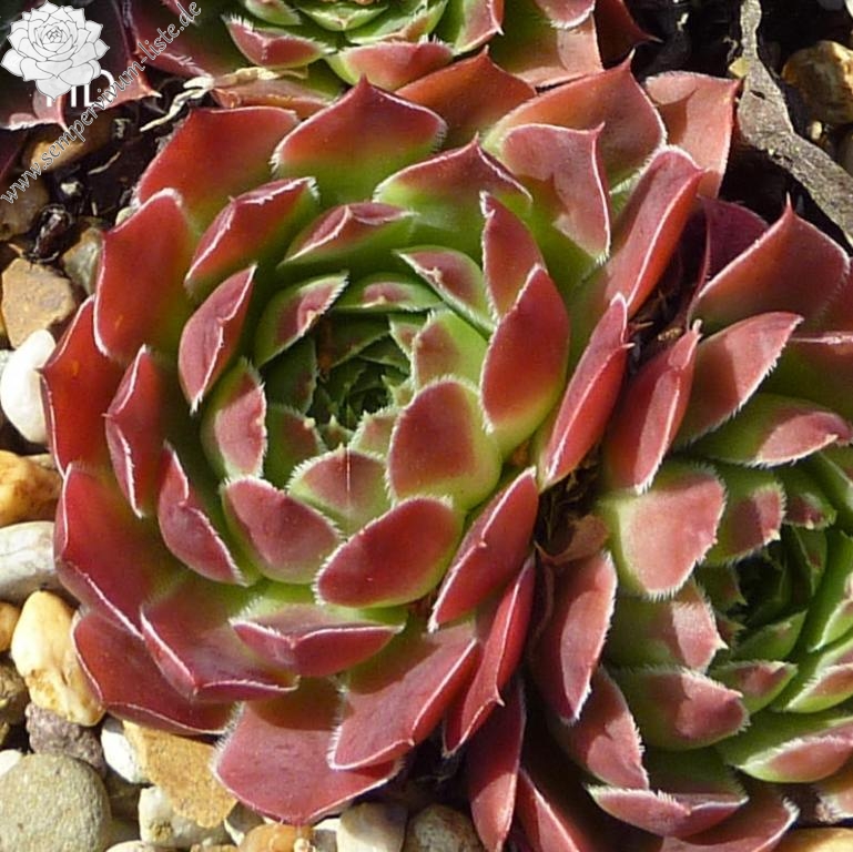 große Rosetten, spatelige Blätter, lang bespitzt, Basis hellgrün, obere Drittel leuchtend rot, Blattränder silbrig bewimpert