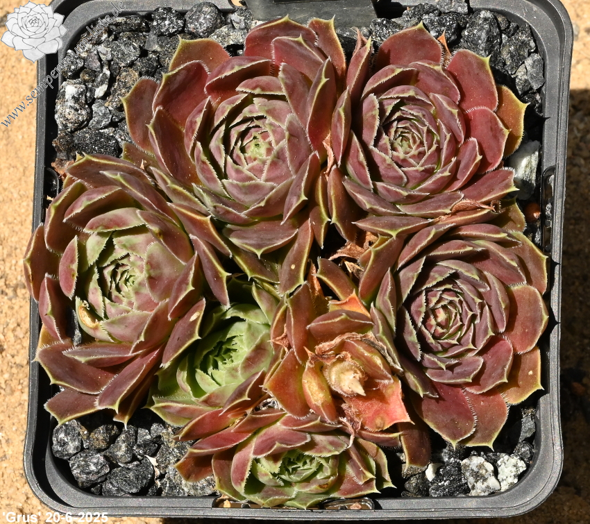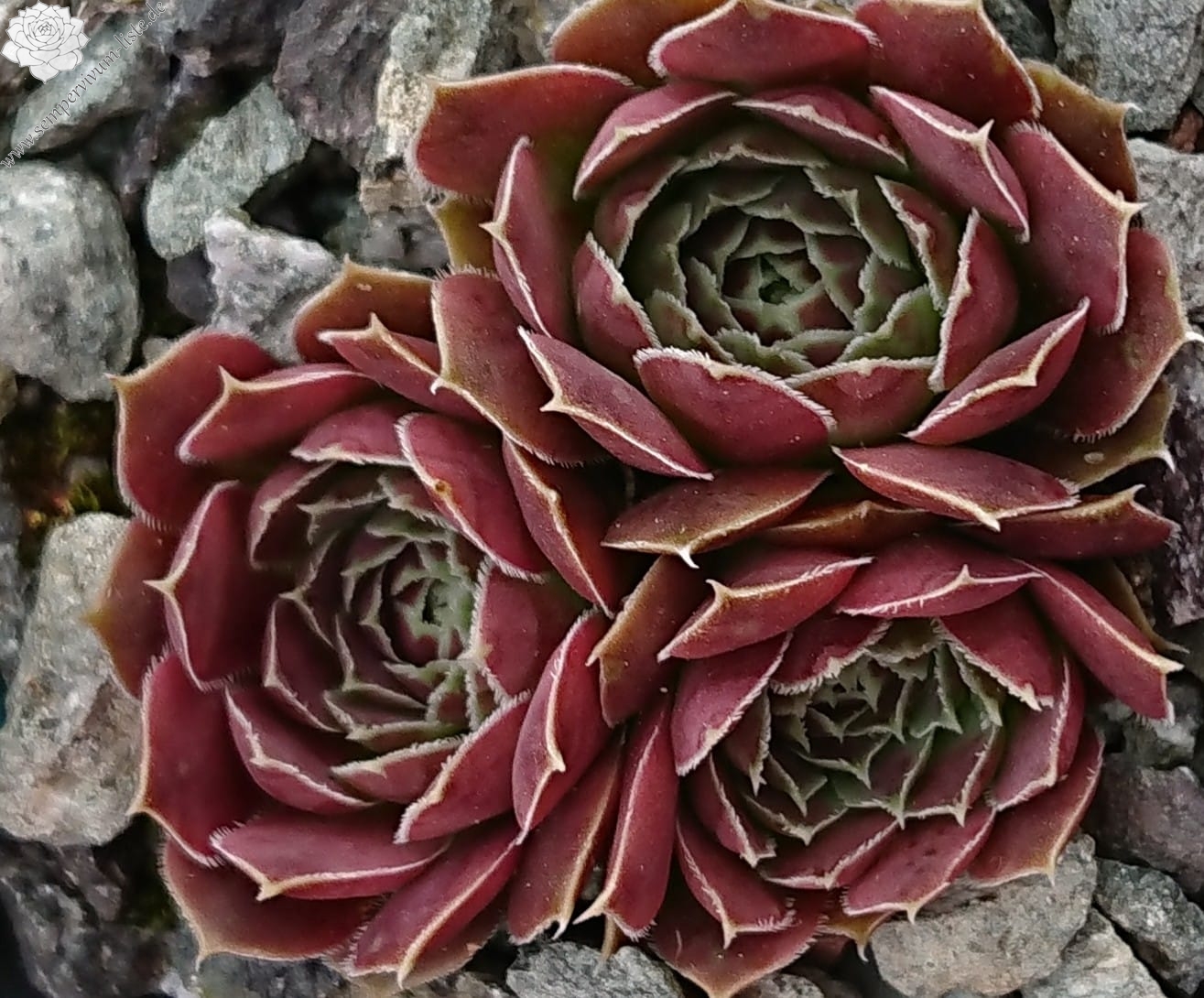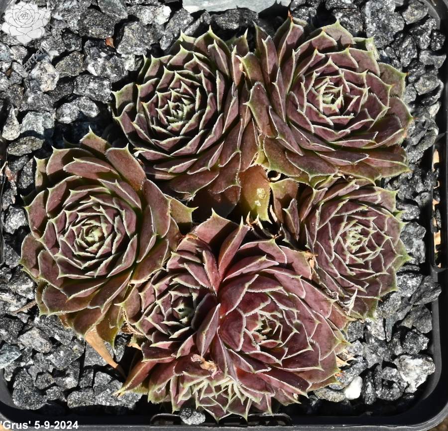 Rosetten bis 5 cm, Blätter oval, lang bespitzt, Mischfarben altrosa - trübes Lila, Blattränder hell, bewimpert