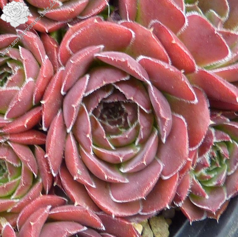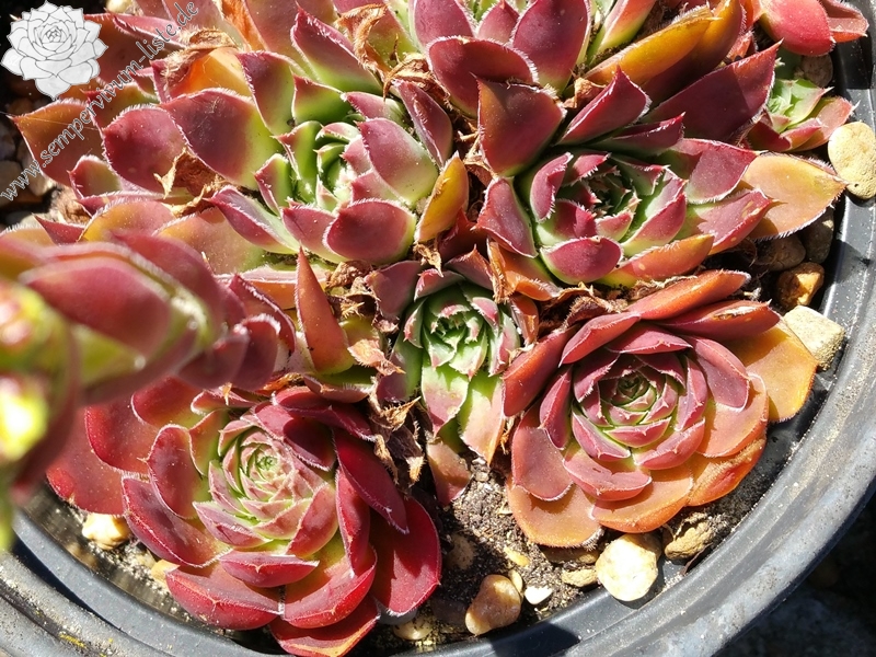 Rosetten 4 - 6 cm, Basis grünlich, Rest orange-rot, Blattränder hell bewimpert